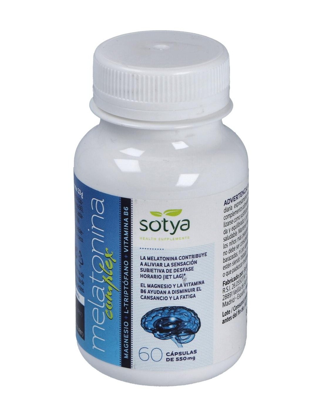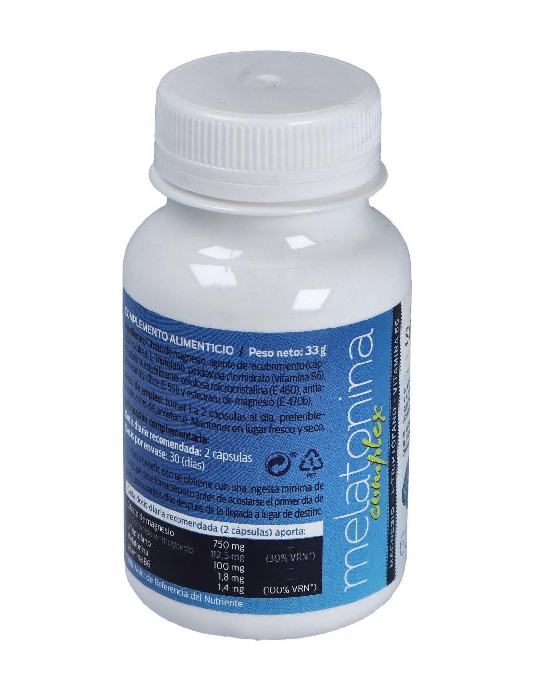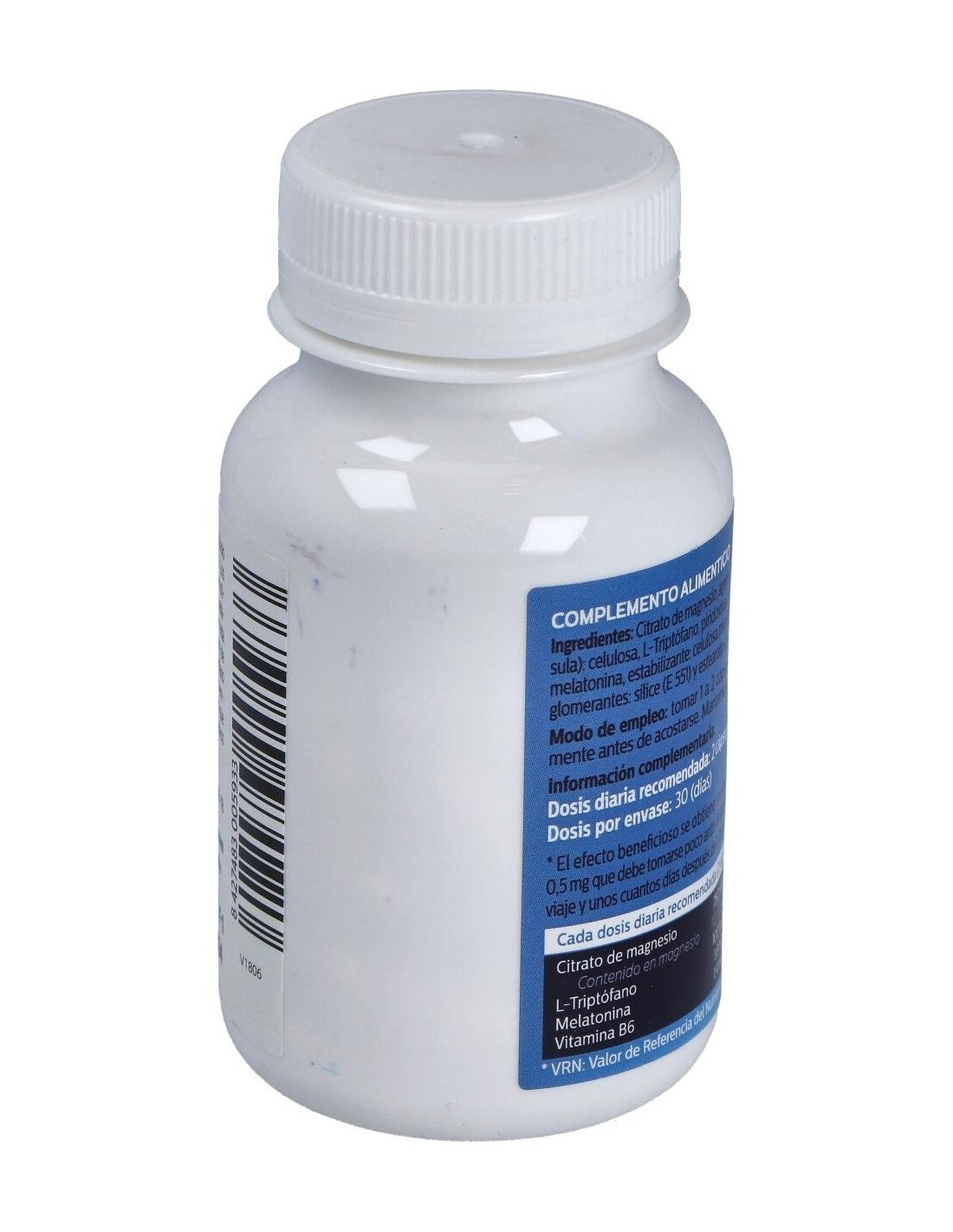 Por 2 cápsulas (dosis diaria recomendada): Citrato de Magnesio (750 mg), L-Triptofano / Triptófano / Trp (100 mg), Melatonina (1.8 mg), Vitamina B6 (1.4 mg).
