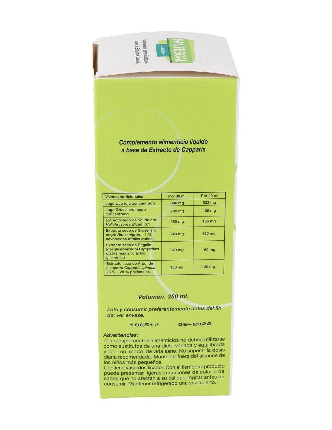 Complemento alimenticio en formato líquido, que contribuye a mejorar los síntomas en épocas de alergias. Contiene una combinación de ingredientes naturales de origen vegetal y un complejo patentado, Pantescal®, que ofrecen un alto efecto antihistamínico al organismo.