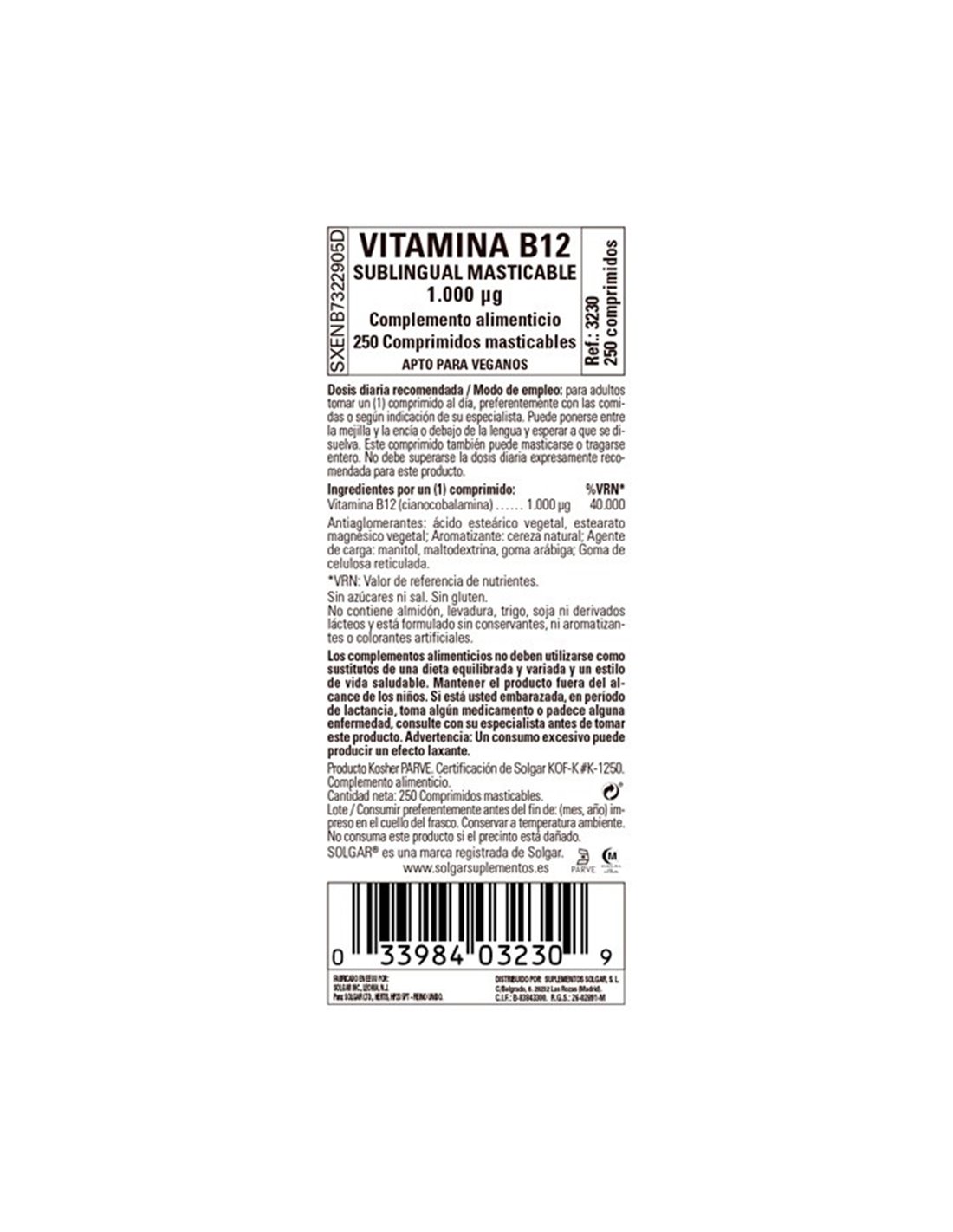Vitamina B12 1000 µg (cianocobalamina) 250 comprimidos masticables Solgar