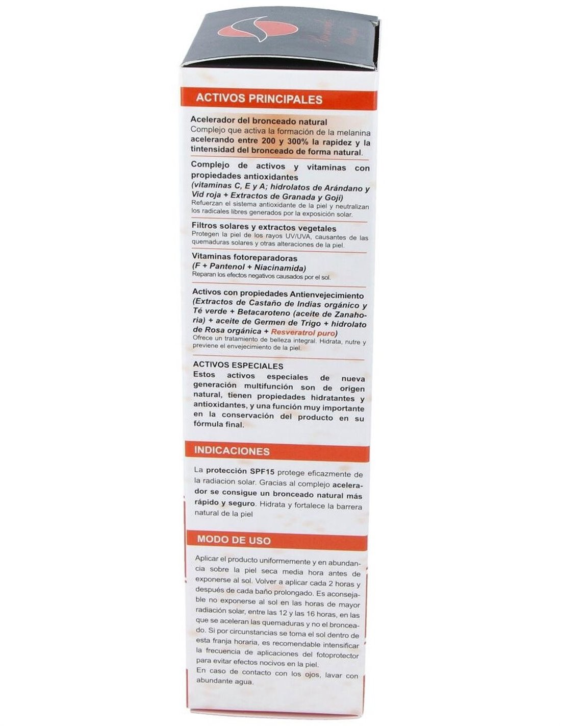 Bronceador ultrarápido, formulado con activos hidratantes y antiedad. El producto facilita protección solar ligera, de factor SPF15. Este es efectivo contra radiación UVA/UVB y previene el envejecimiento celular. La fórmula contiene también acción contra radicales libres. Contribuye a obtener un profundo y duradero bronceado natural desde las primeras exposiciones. Incorpora activos que estimulan y activan la producción natural de Melanina.