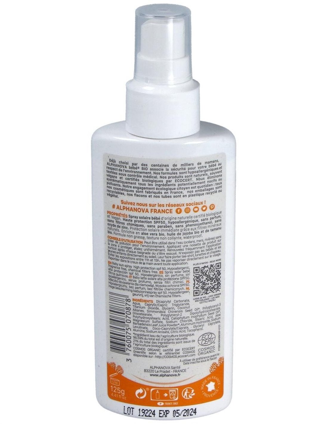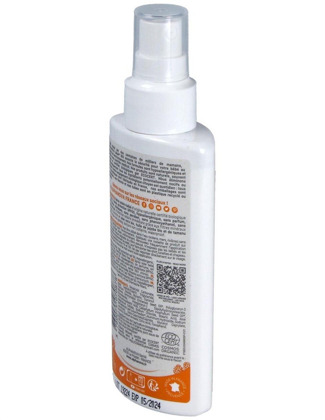 Protector solar para bebés en formato spray, formulado con aloe vera, aceite de jojoba y tamanu, componentes provenientes de cultivos con certificado biológico, facilita una protección óptima contra los rayos del sol en bebés. Sin parabenos, ni nanopartículas, ni perfume. Probado dermatológicamente. Waterproof. Vegano.