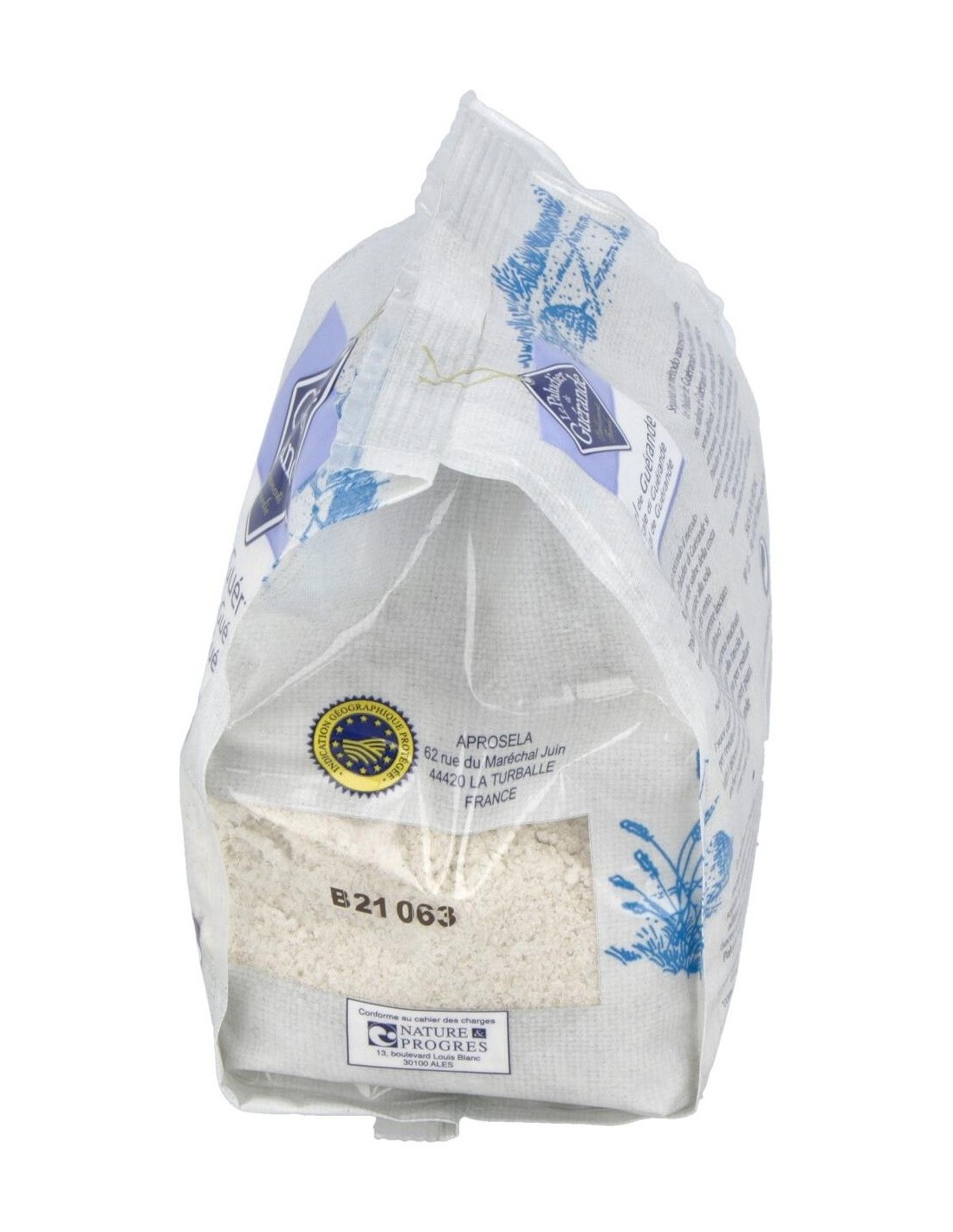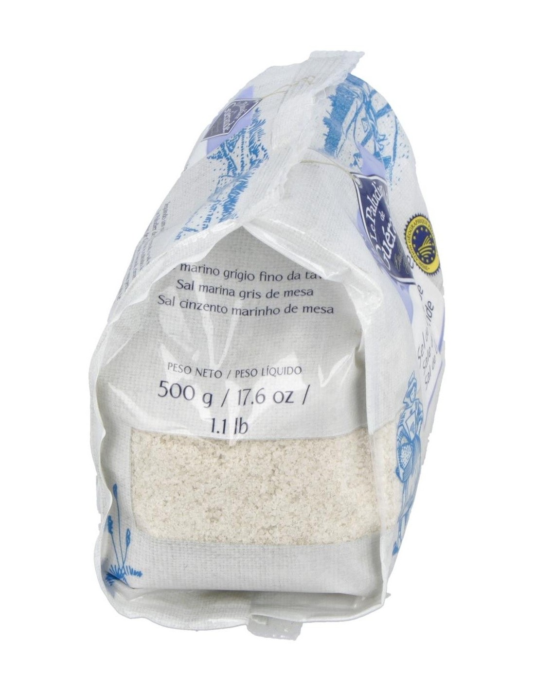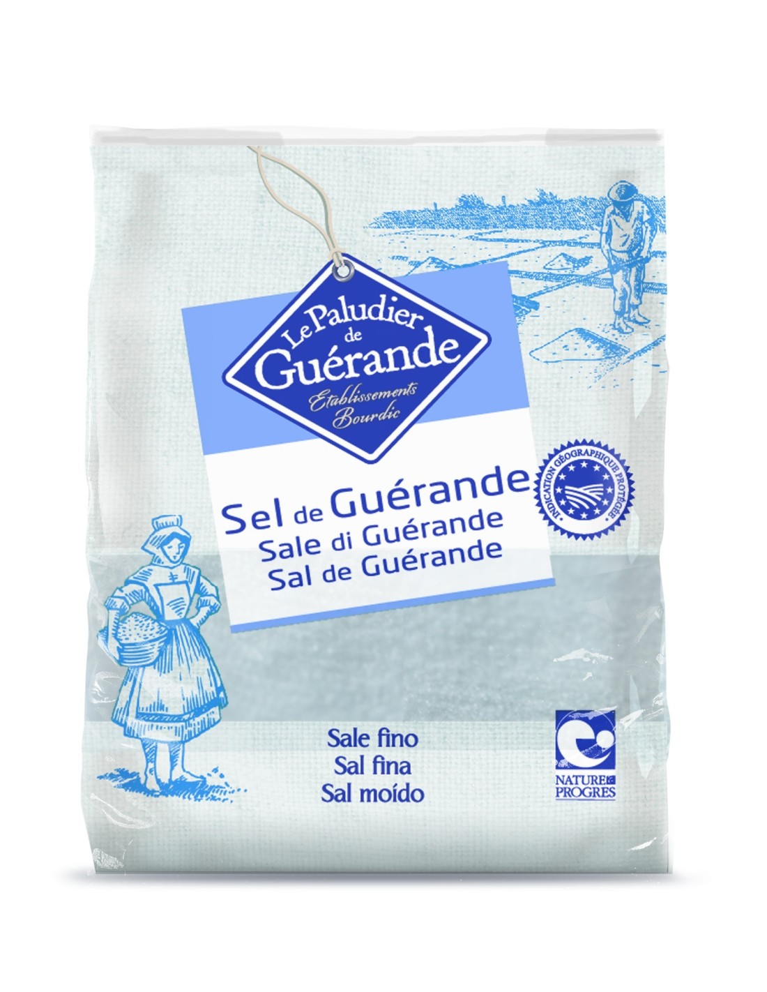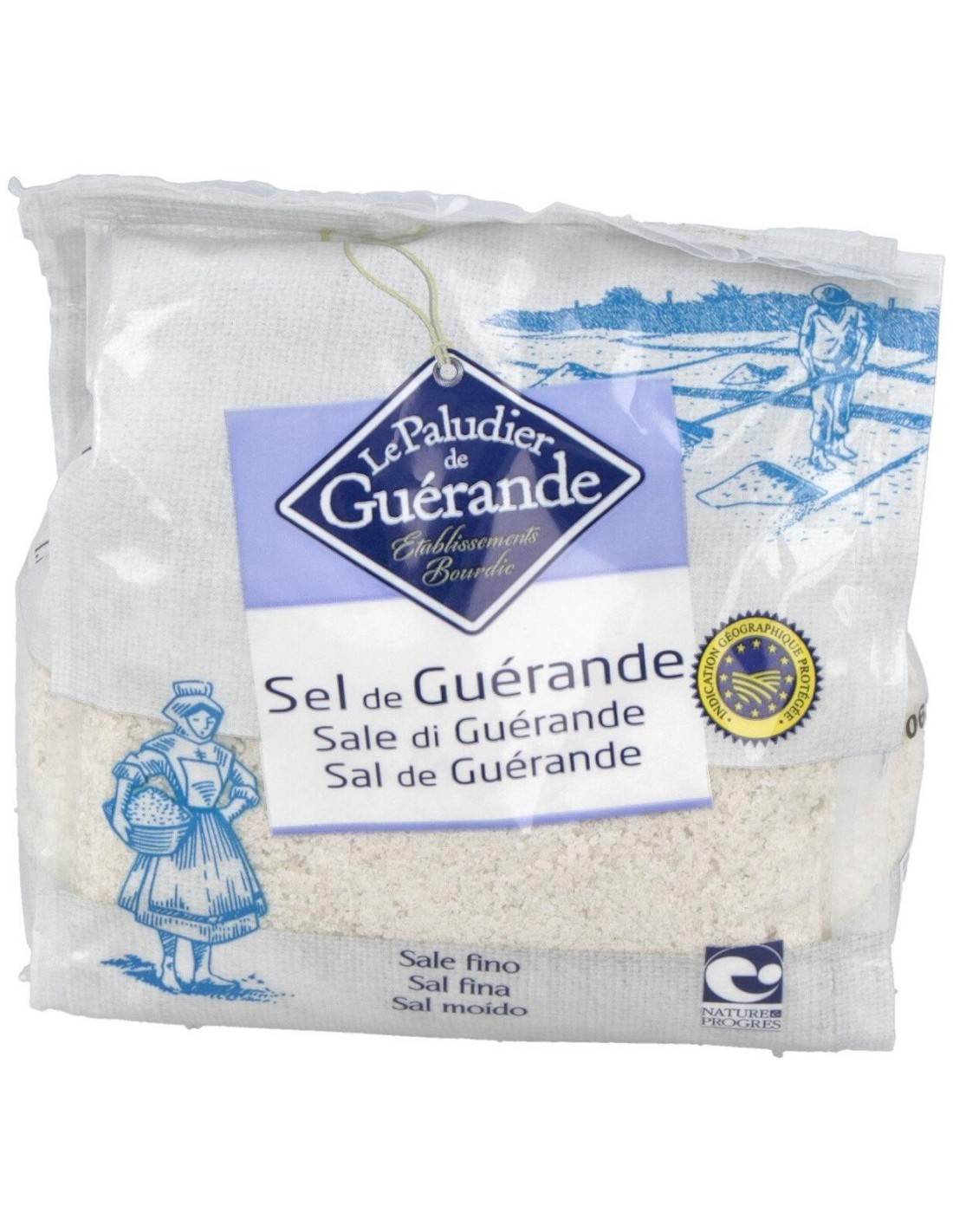Sal Marina Gris Fina de Guerande hecha a partir de la sal gruesa de Guérande que se drena al sol, se seca y se muele. Su color natural es el gris y no se utiliza ningún aditivo para cambiar su color, siendo una sal más natural de esta forma. Es un condimento esencial para todas las recetas de cocina y también puede utilizarse como sal de mesa.