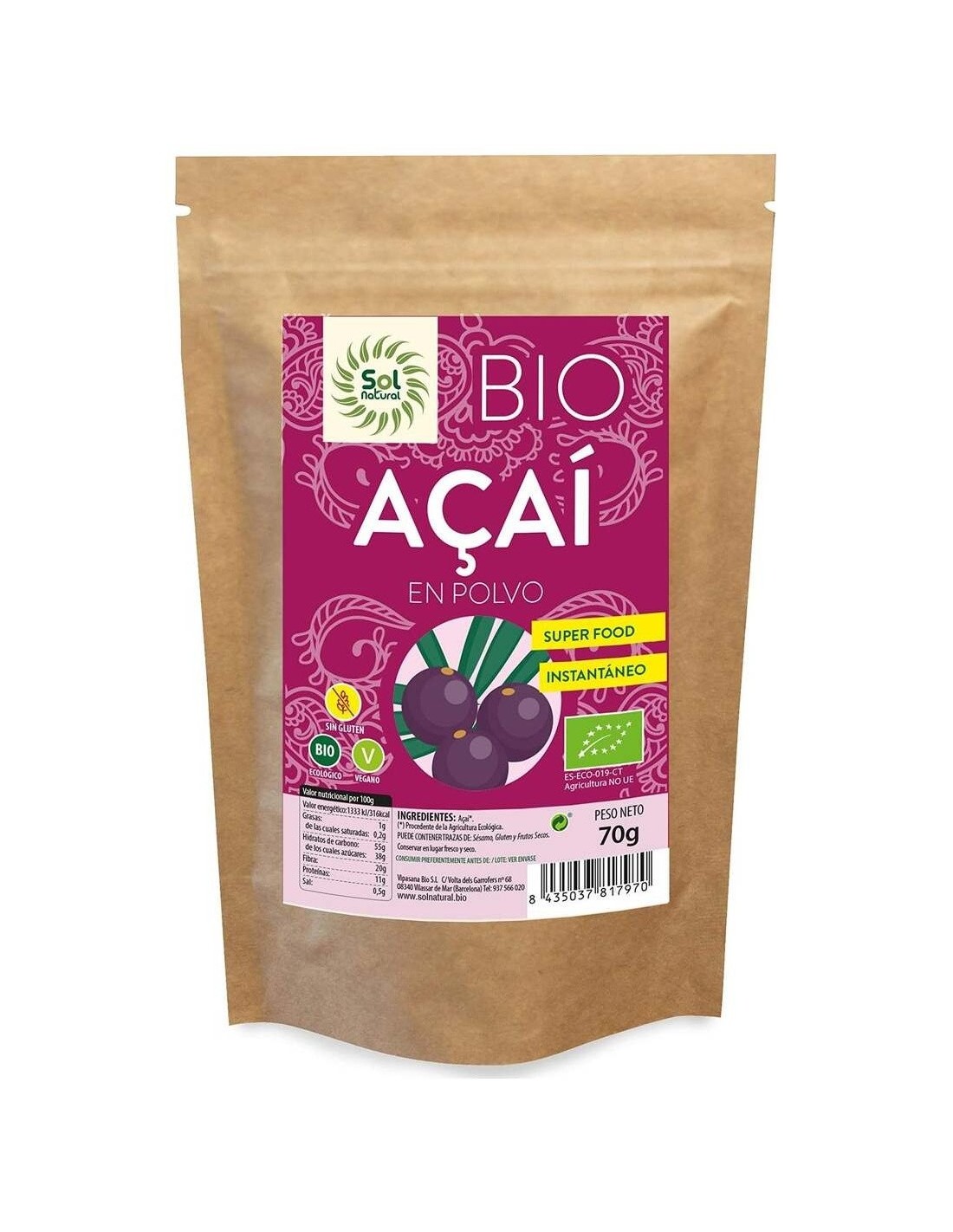 Acaí en polvo procedente de cultivo ecológico. La fruta de acaí contiene 16 aminoácidos, minerales como calcio, zinc, magnesio, hierro y mucho potasio. Aporta vitamina E, vitamina C y vitaminas del grupo B, que ayudan a proteger las células del cuerpo del estrés oxidativo. Es un producto vegano y biológico considerado un super alimento. Recomendado para desayunos, meriendas, jugos y batidos. Vegano.
