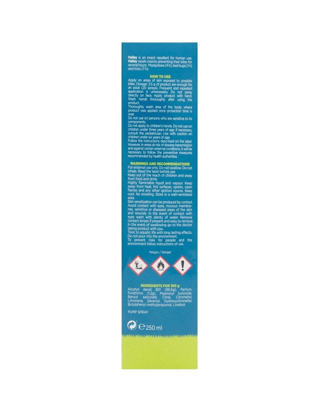 Halley repelente de insectos 250ml es un spray antimosquitos y repelente de insectos que aprovecha las propiedades del extracto natural de pirethrum, obtenido de una flor del tipo crisantemo llamado piretro. Ayuda a alejar a los mosquitos y otros insectos y evitar así sus picaduras y las molestias que conllevan.