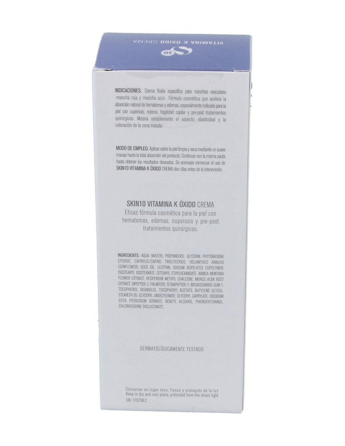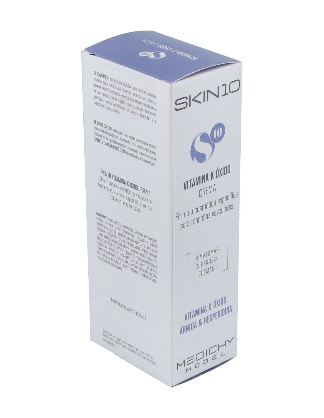 Crema calmante indicada para todo tipo de piel. Elaborada con vitamina K, óxido, extracto de árnica y hesperidina. Contribuye a mejorar el aspecto, elasticidad y coloración de la zona de la piel tratada. Con una fórmula cosmética para el tratamiento en casos de contusiones, hematomas, edemas y cuperosis. Recomendada para pre y post tratamientos quirúrgicos. Favorece la reabsorción y prevención de hematomas en la piel. Dermatológicamente testeado. Envasado en atmósfera limpia.