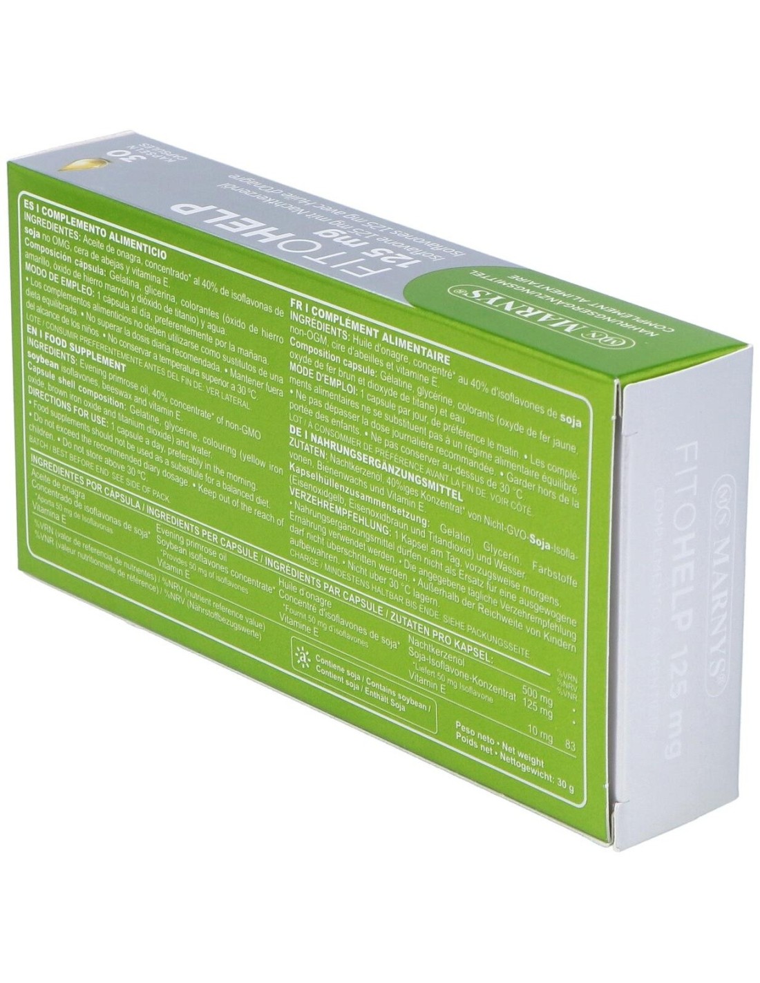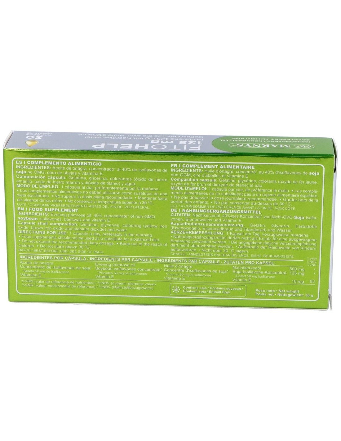Aceite de onagra (500 mg), isoflavonas de soja (No GMO), cera de abejas y vitamina E natural.