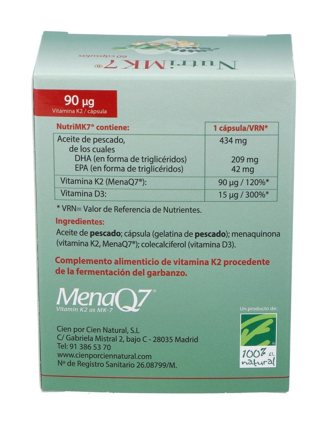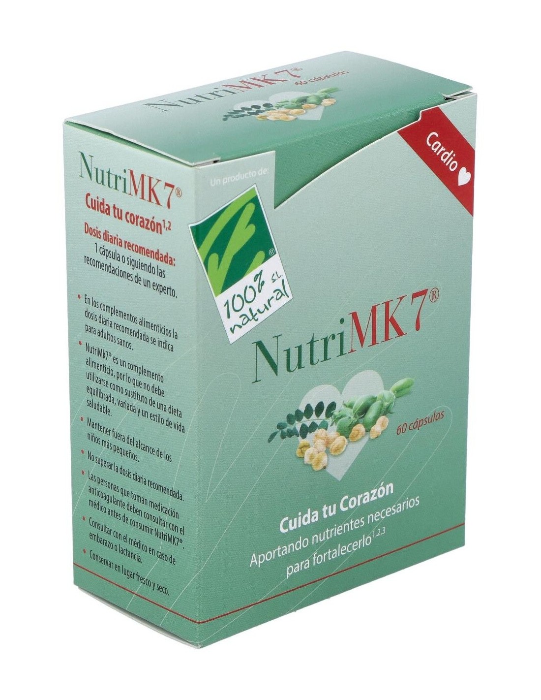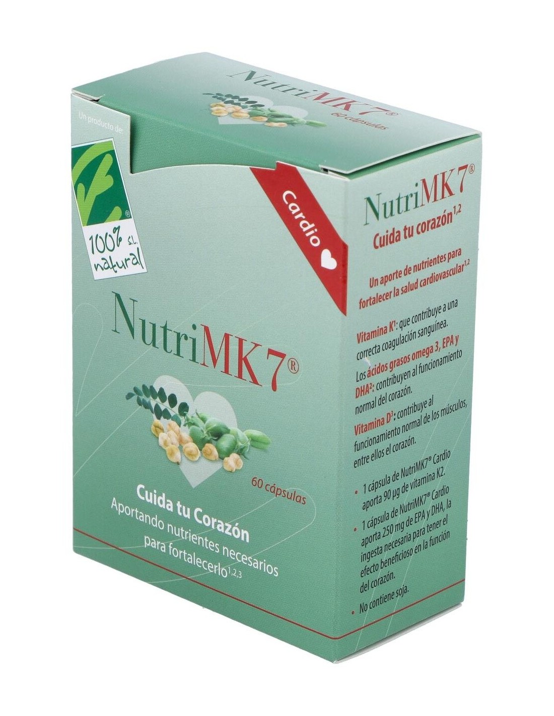 100% Natural NutriMK7 Cardio Caja con 60 cápsulas vegetales contiene vitamina K2 vegetal en forma de menaquinona (MK-7), extraída de fermentos naturales. Con el objetivo de potenciar las propiedades de la vitamina K2 en la fijación del calcio a los huesos, se ha añadido vitamina D3.