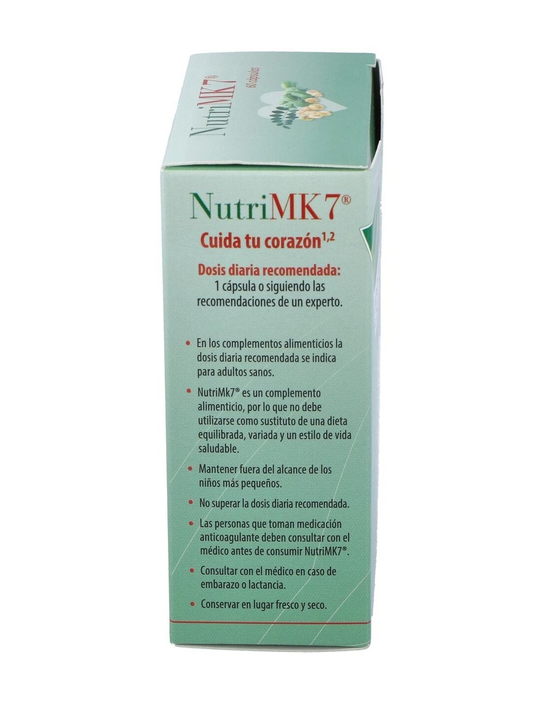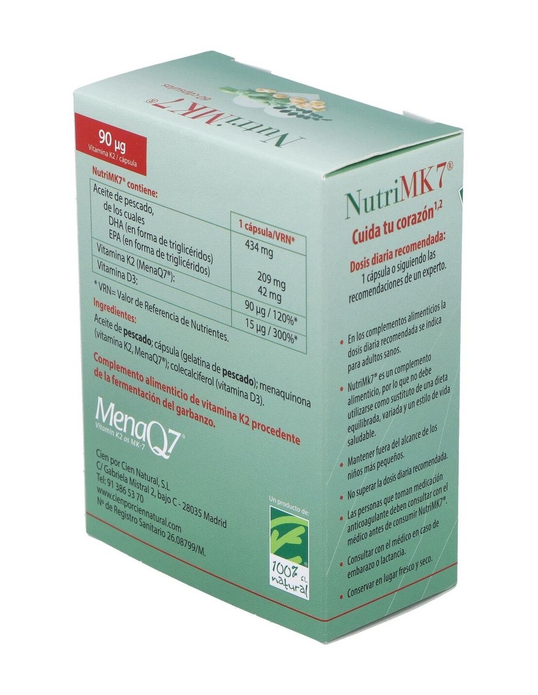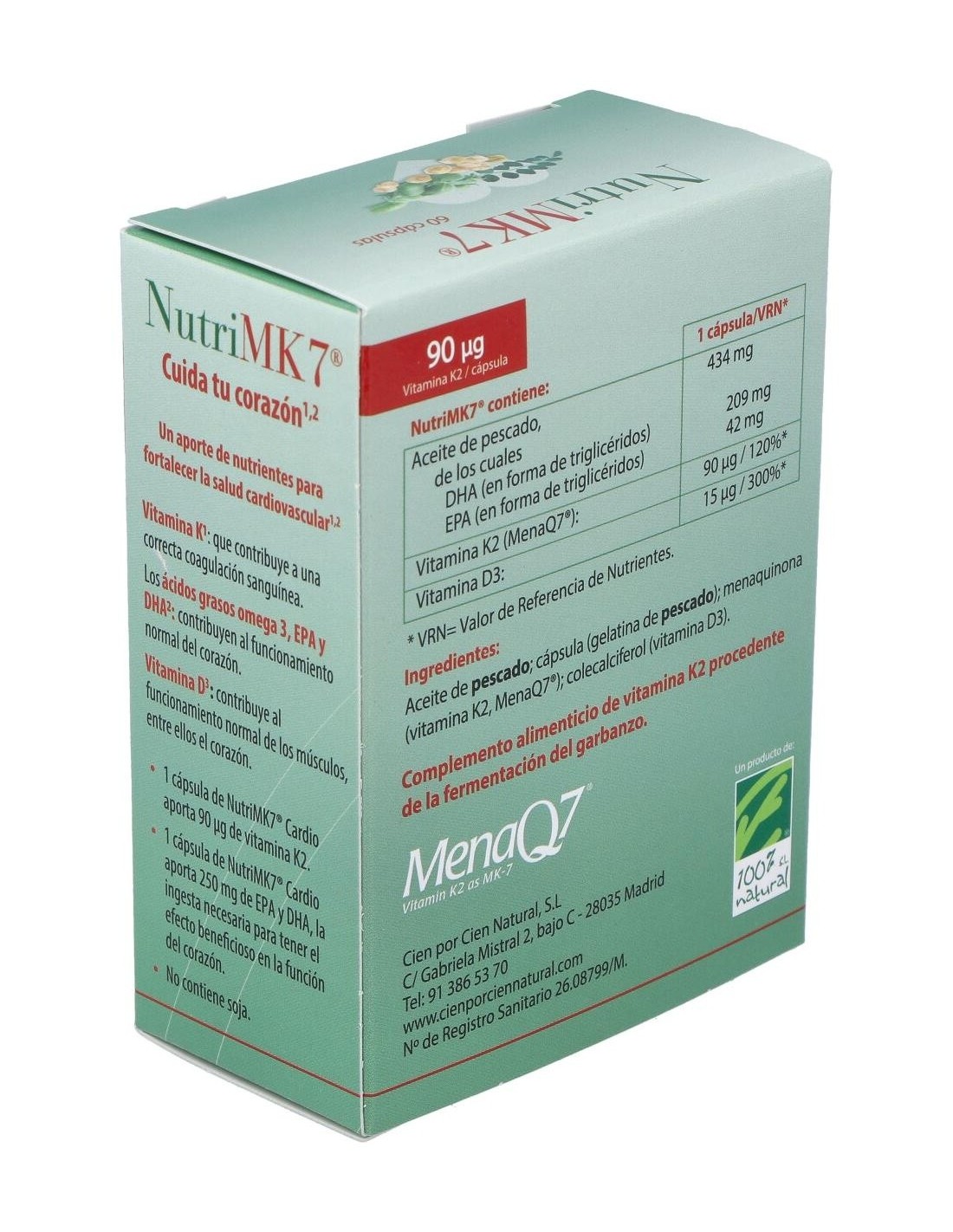 100% Natural NutriMK7 Cardio Caja con 60 cápsulas vegetales contiene vitamina K2 vegetal en forma de menaquinona (MK-7), extraída de fermentos naturales. Con el objetivo de potenciar las propiedades de la vitamina K2 en la fijación del calcio a los huesos, se ha añadido vitamina D3.