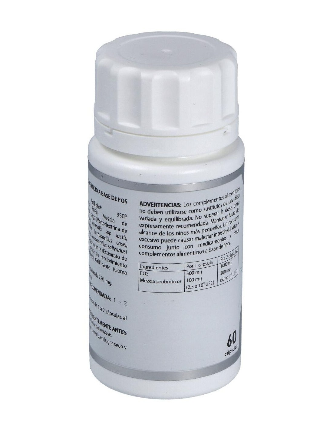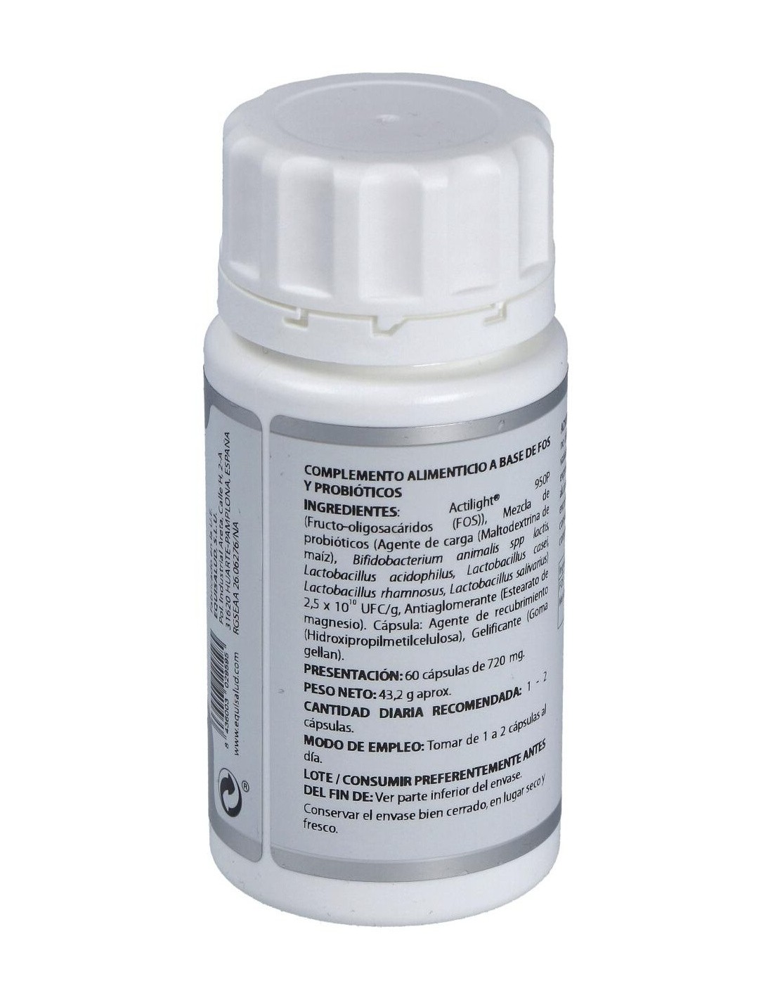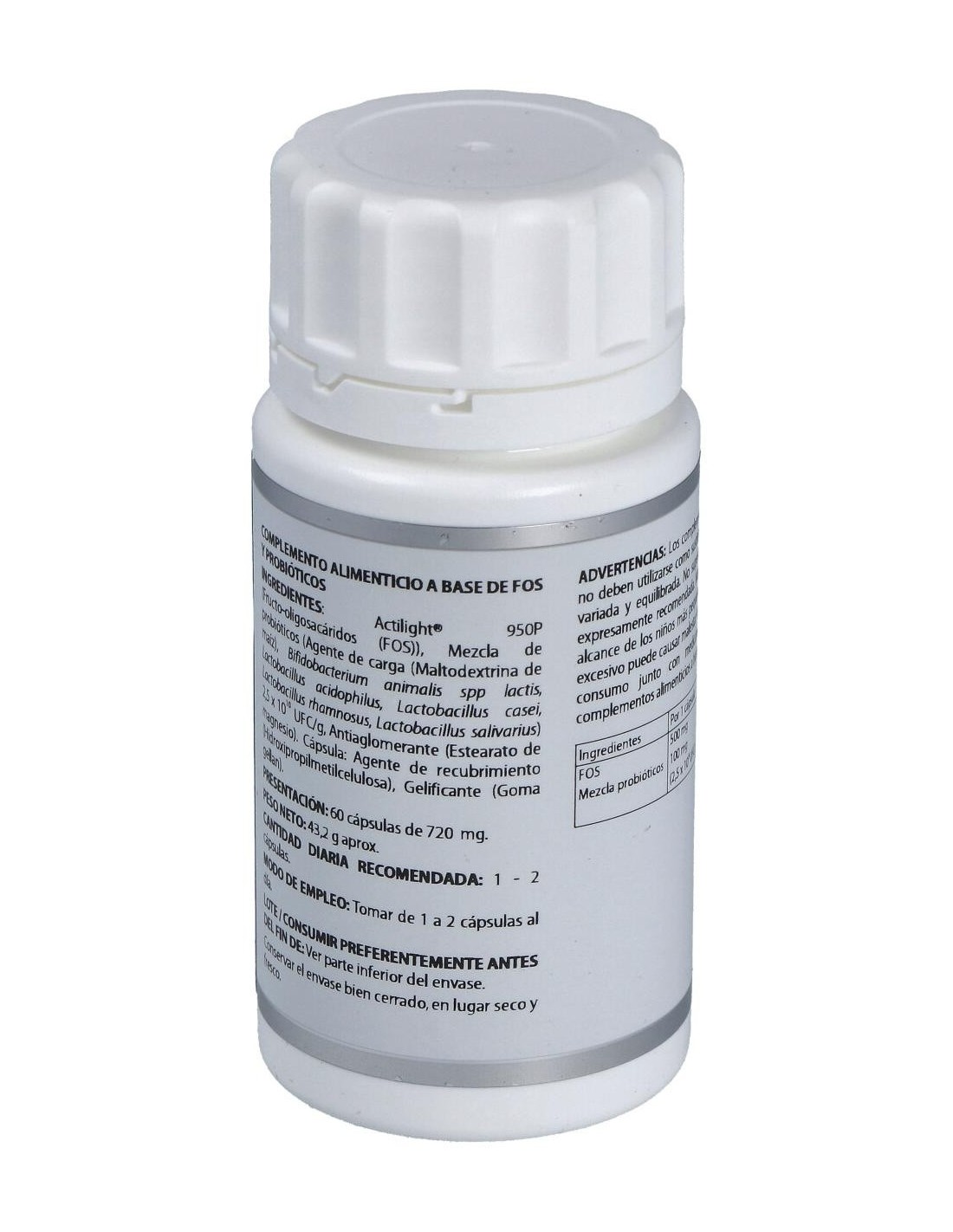 Actilight® 950P (Fructo-oligosacáridos (FOS)), 500 mg: mezcla de probióticos (maltodextrina de maíz (agente de carga), Bifidobacterium animalis spp lactis, Lactobacillus acidophilus, Lactobacillus casei, Lactobacillus rhamnosus, Lactobacillus salivarius) 2,5x1010 UFC/g, 100 mg. Excipiente tecnológico: estearato de magnesio (antiaglomerante), c.s. Envoltura: agente de recubrimiento (hidroxipropilmetilcelulosa) y gelificante (goma gellan).
