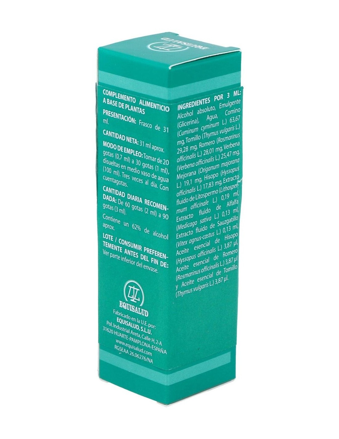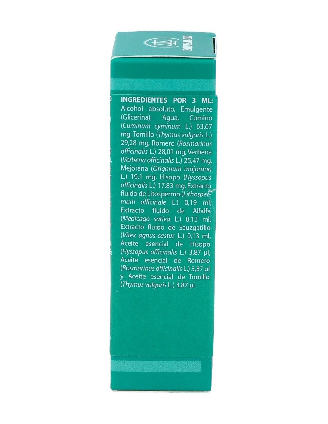 Comino (Cuminum cyminum L.), tomillo (Thymus vulgaris L.), romero (Rosmarinus officinalis L.), verbena (Verbena officinalis L.), mejorana (Origanum majorana L.), hisopo (Hyssopus officinalis L.), litospermo (Lithospermum officinale L.), alfalfa (Medicago sativa L.) y sauzgatillo (Vitex agnus-castus L.). Diluyentes: alcohol absoluto, glicerina y agua purificada