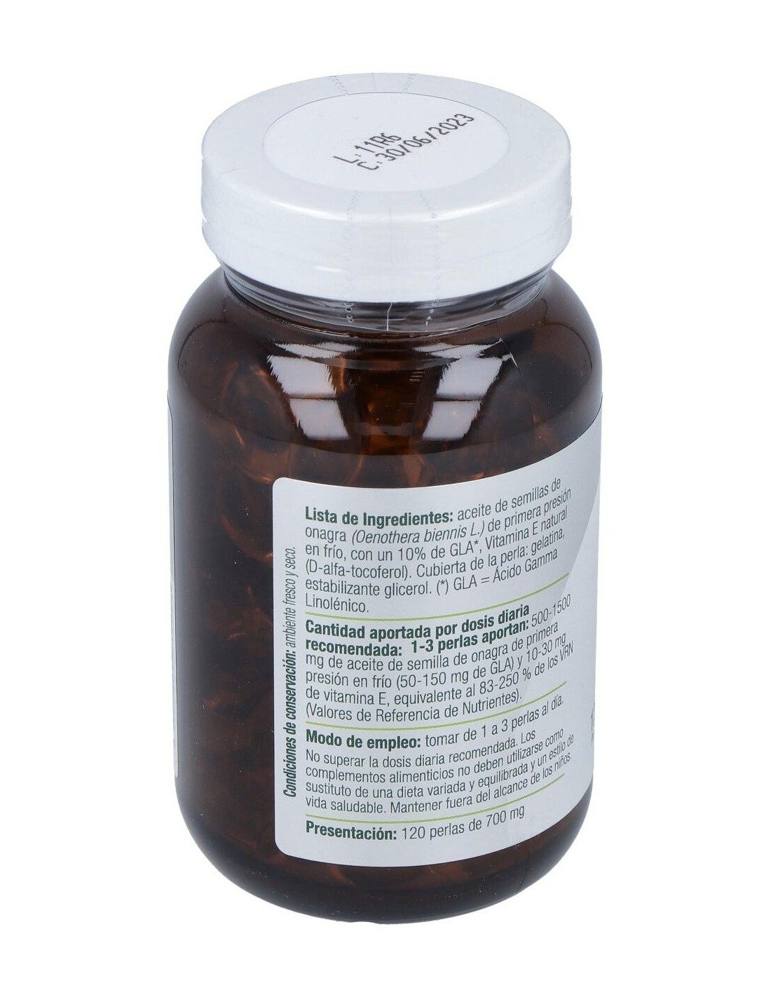 Aceite de semillas de onagra (Oenothera biennis L.) de primera presión en frío, con un 10% de GLA, Vitamina E natural (D-alfa-tocoferol). Cubierta de la perla: gelatina, estabilizante glicerol.
