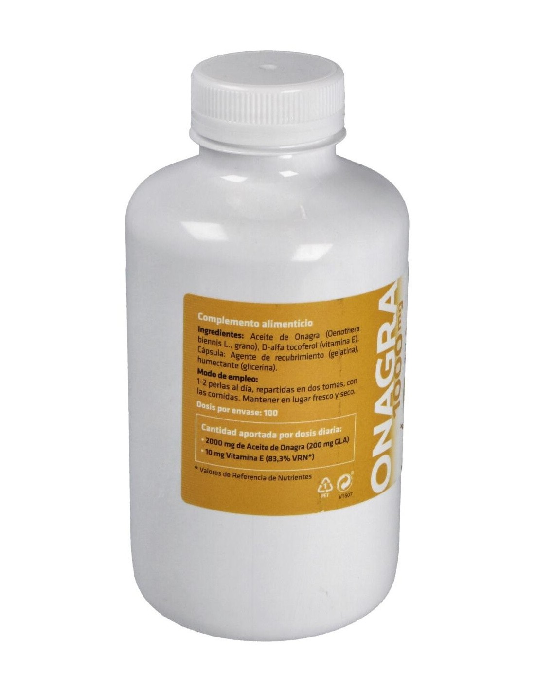 Perlas con 1000mg de aceite de onagra de primera presión en frío con min. 10% GLA, 5mg de vitamina E natural, d-alfa tocoferol acetato (50% CDR). Cobertura de gelatina y glicerina. Peso total aproximado 1390mg (incluida cobertura).