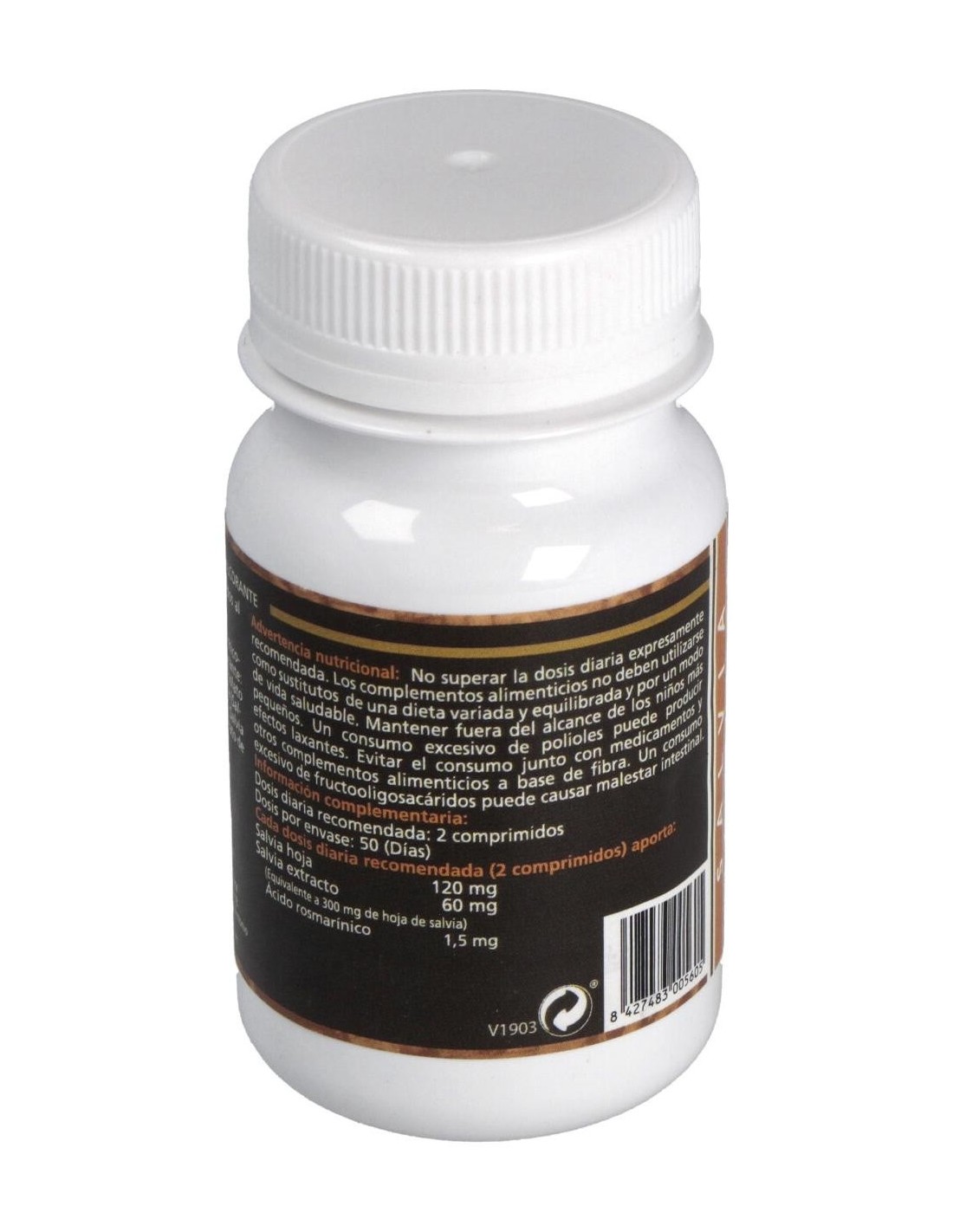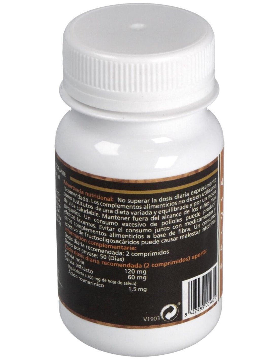 Agentes de carga (fructoligosacáridos, isomaltitol, fosfato cálcico), Salvia officinalis liofilizada (120mg), Salvia officinalis extracto (60mg con un 2,5% de ácido rosmarínico) y antiaglomerantes (estearato de magnesio).