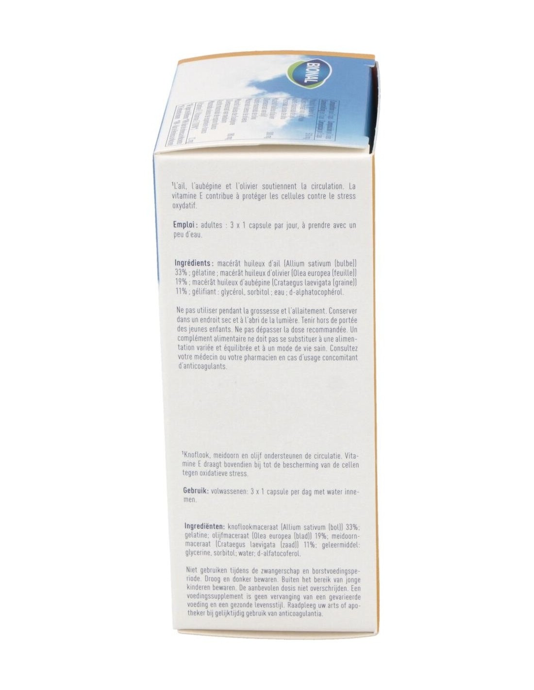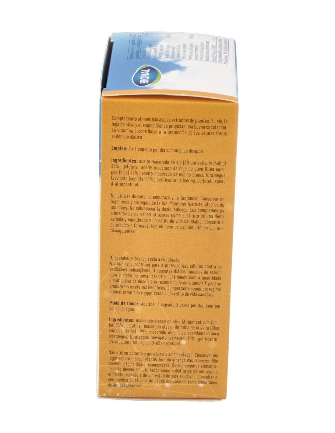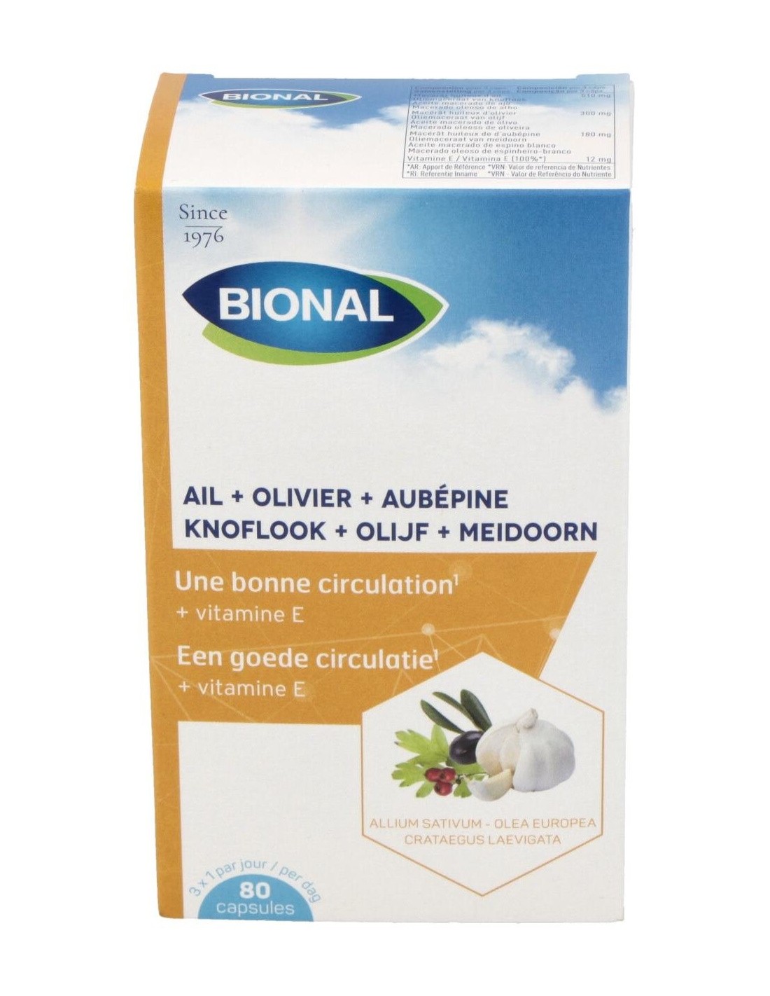 Aceite macerado de ajo (Allium sativum, aceite de girasol) 33%: gelatina: aceite macerado de hoja de olivo (Olea europea, aceite de girasol) 19%: aceite macerado de espino blanco (Crataegus laevigata, aceite de girasol) 11%: gelificante: glicerina: d-alfatocoferol.