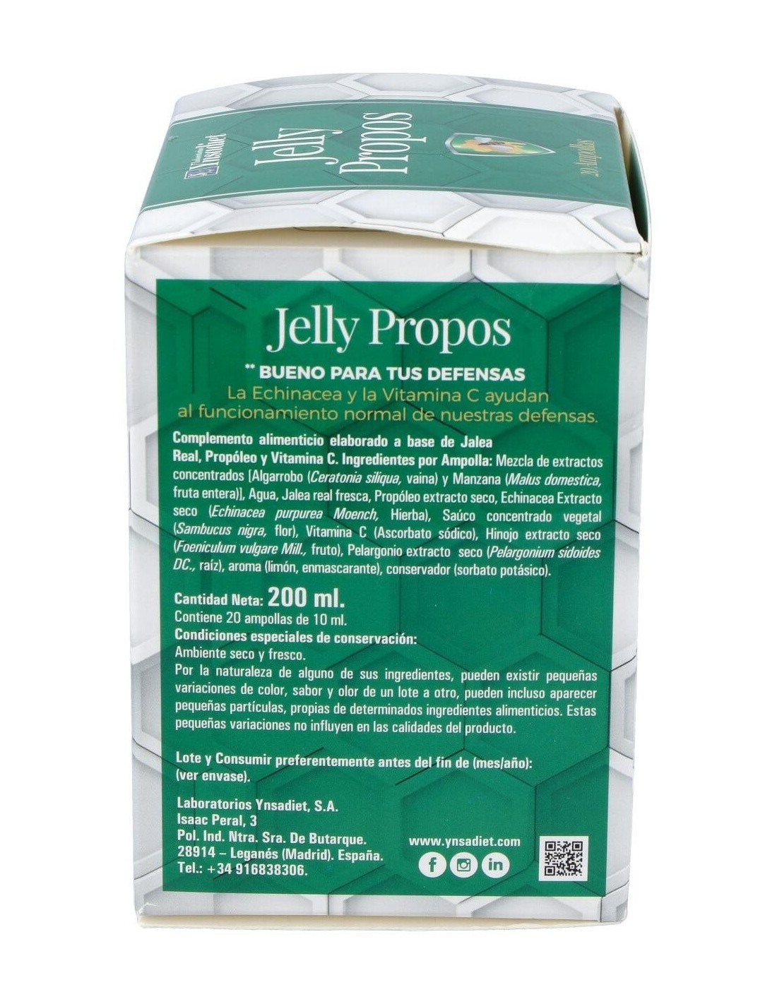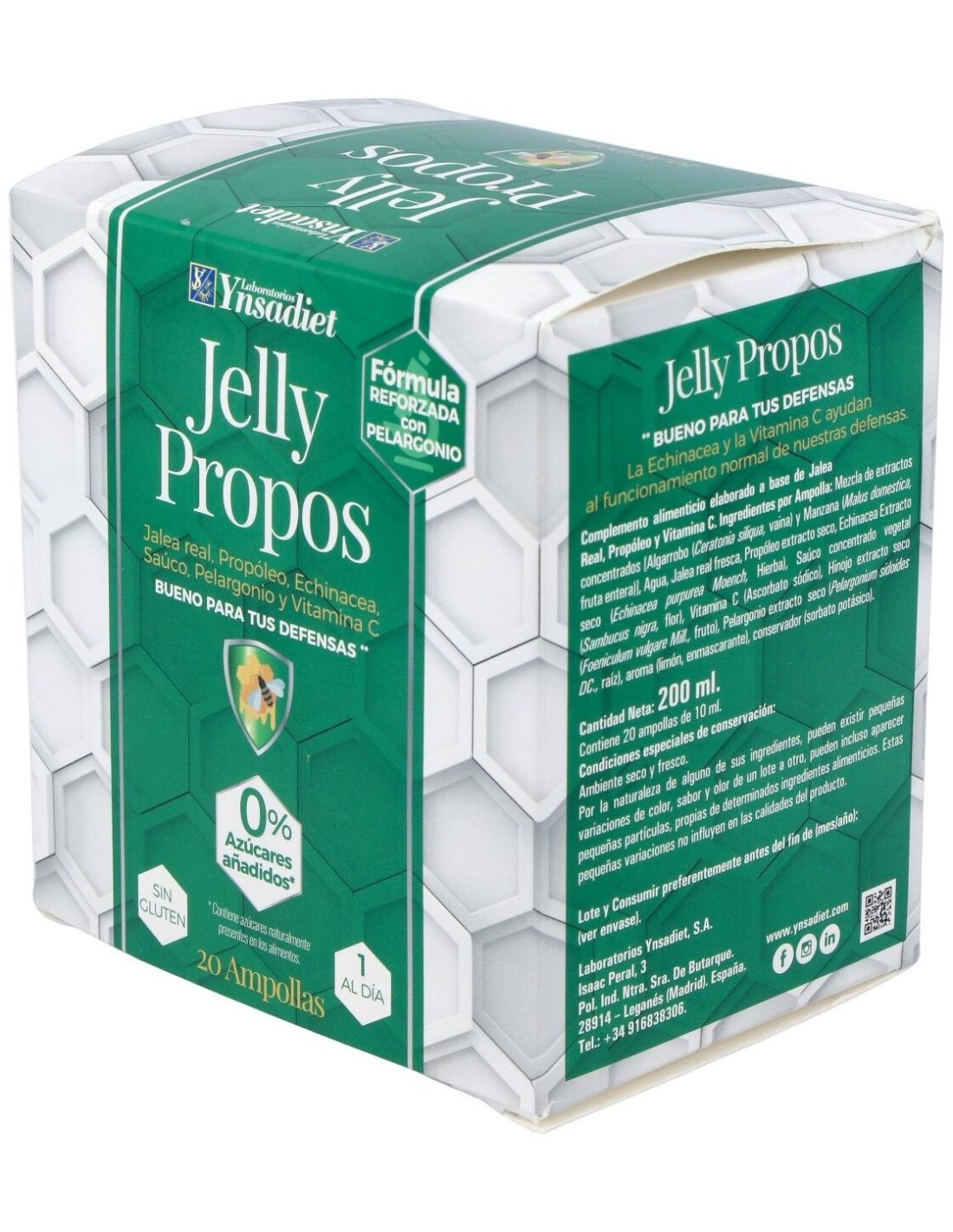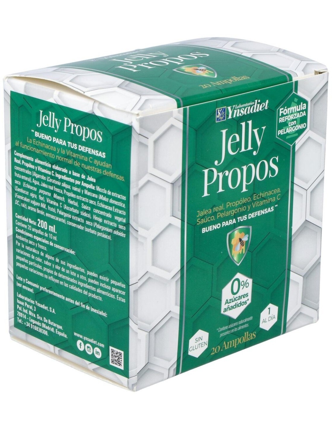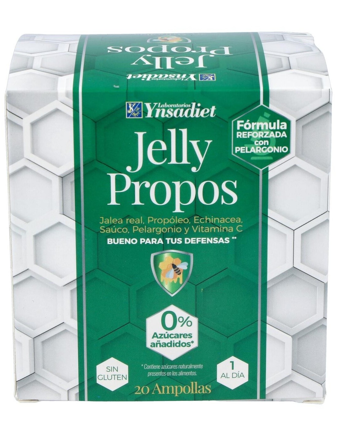Ynsadiet Jelly Propos es un complemento alimenticio a base de jalea real y própoleo que aporta vitalidad y energía. Además, ayuda a reforzar el sistema inmunitario gracias a su aporte de vitamina C. Está especialmente indicado para personas con sensibilidad a los cambios climáticos.