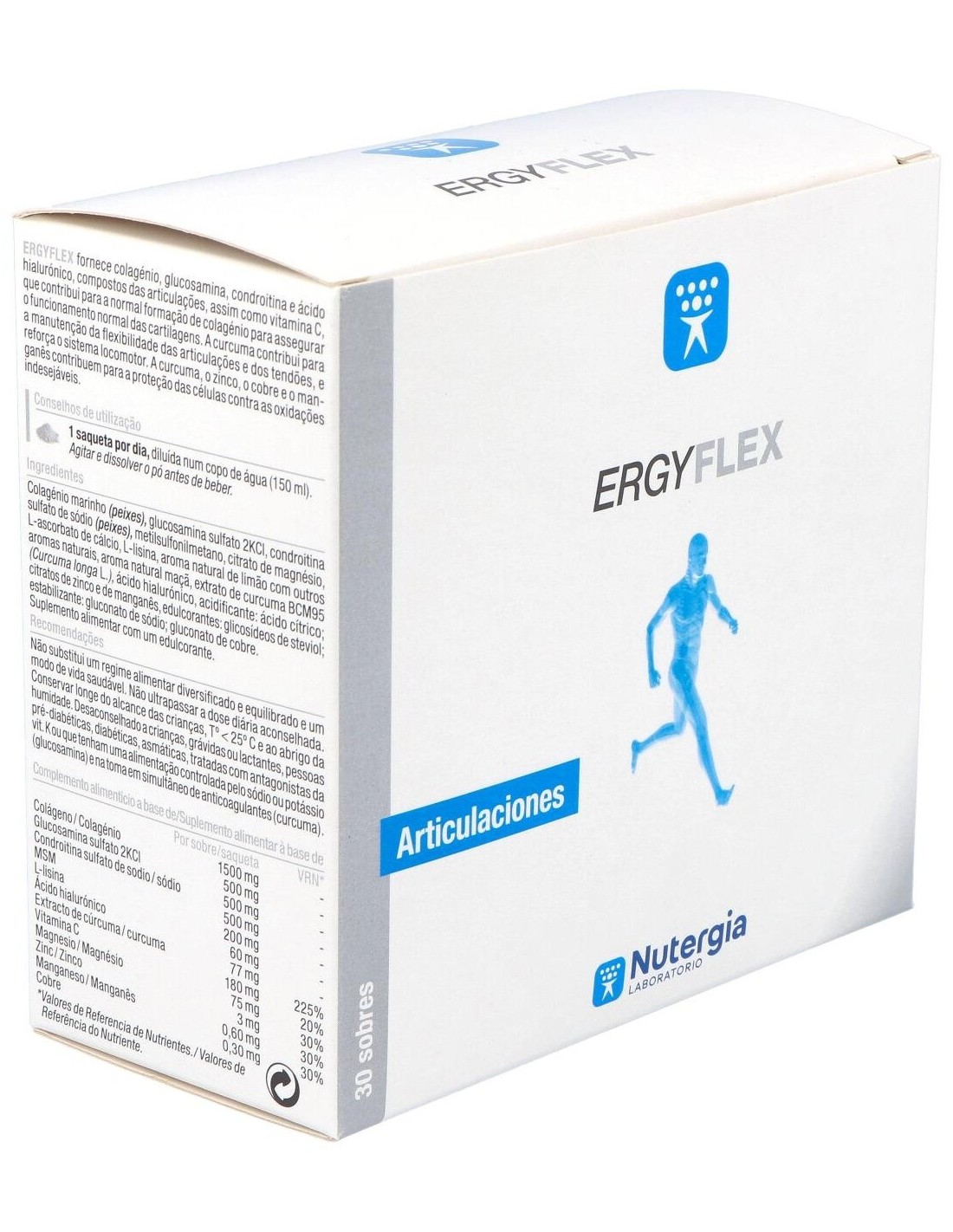 Aporta colágeno previamente hidrolizado, sulfatos de condroitina y de glucosamina, ácido hialurónico y MSM, que son componentes clave para el normal mantenimiento de los cartílagos y de la piel, junto con una asociación de otros activos importantes para potenciar este efecto como son la vitamina C, el manganeso, el magnesio, el zinc, el cobre y la cúrcuma.