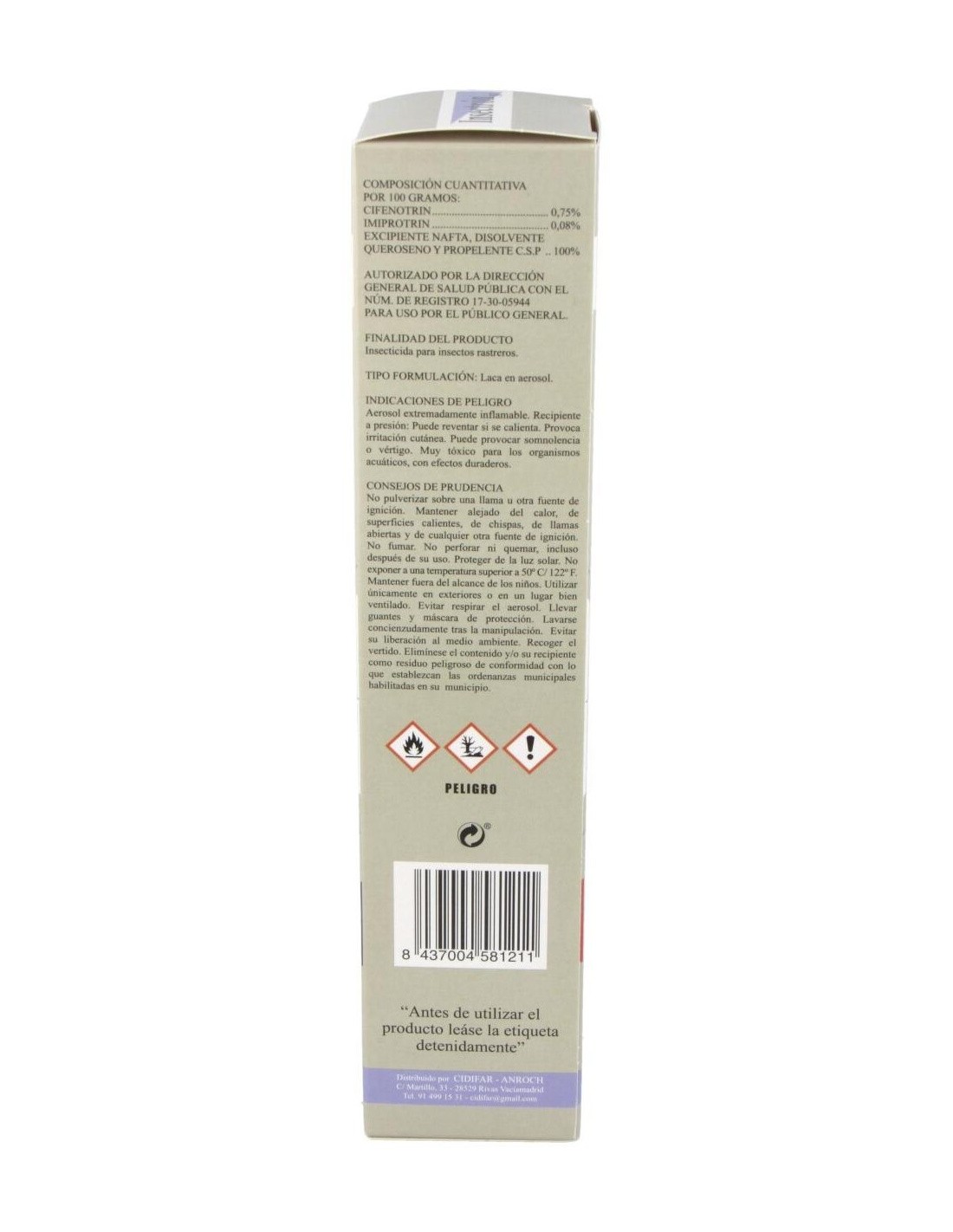 Laca insecticida de uso doméstico contra insectos rastreros. Su acción es instantánea y perdurable durante un año.