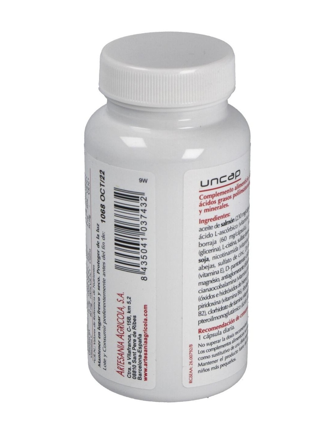 Complemento alimenticio formulado a base de aceite de salmón y borraja combinados con vitaminas, minerales y aminoácidos. Contribuye al mantenimiento de piel, cabello y uñas en condiciones normales. Sus ingredientes favorecen la regeneración celular. Indicado para adultos.