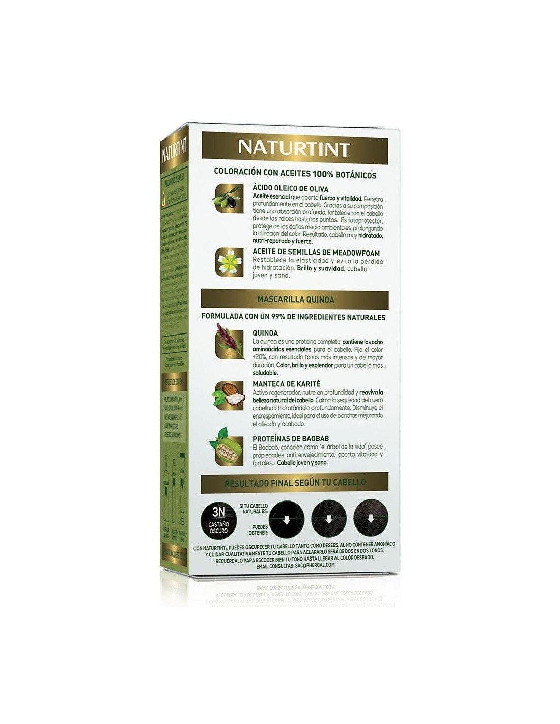 COLORACIÓN NATURTINT 60 ml: PEG-2 OLEAMINE. AQUA (PURIFIED WATER). ALCOHOL DENAT. PEG-4 RAPESEEDAMIDE. PROPANEDIOL. OLEIC ACID. ETHANOLAMINE. HYDROLYZED OAT PROTEIN. HYDROLYZED CORN PROTEIN. HYDROLYZED SOY PROTEIN. HYDROLYZED WHEAT PROTEIN. LIMNANTHES ALBA SEED OIL. TETRASODIUM GLUTAMATE DIACETATE. SODIUM METABISULFITE. SODIUM ERYTHORBATE. p-PHENYLENEDIAMINE. 4-CHLORORESORCINOL. 2-AMINO 4-HYDROXYETHYLAMINOANISOLE SULFATE. N,N-BIS (2-HYDROXYETHYL)-p PHENYLENEDIAMINE SULFATE. 4-AMINO-2-HYDROXYTOLUENE. m-AMINOPHENOL. OCTADECYL DI-T-BUTYL-4-HYDROXYHYDROCINNAMATE.