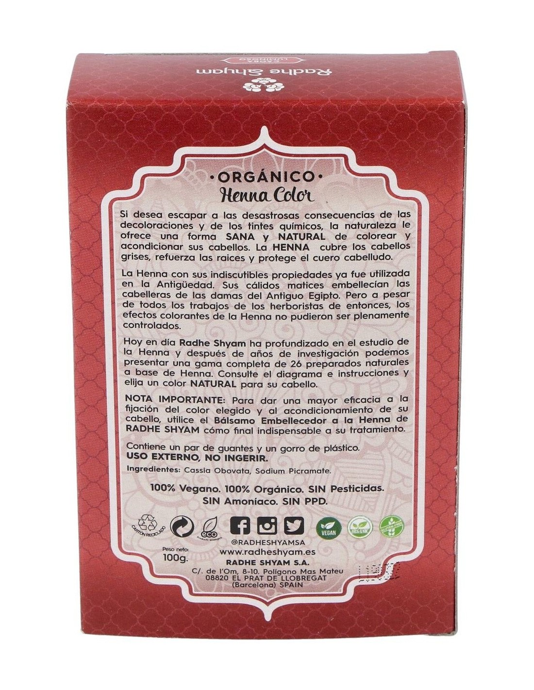 Producto en polvo como tinte 100% natural, con certificado ecológico, y con una gran reputación en el mundo de la coloración natural del cabello, tiñe el cabello sin dañarlo. Ofrece una forma sana y natural de colorear y acondicionar los cabellos. La henna cubre los cabellos grises, refuerza las raíces y protege el cuero cabelludo. La henna es el polvo de una planta, la Lawsonia Inermis, que contiene una molécula llamada Lawsona. Esta molécula interactúa con la queratina natural del cabello.