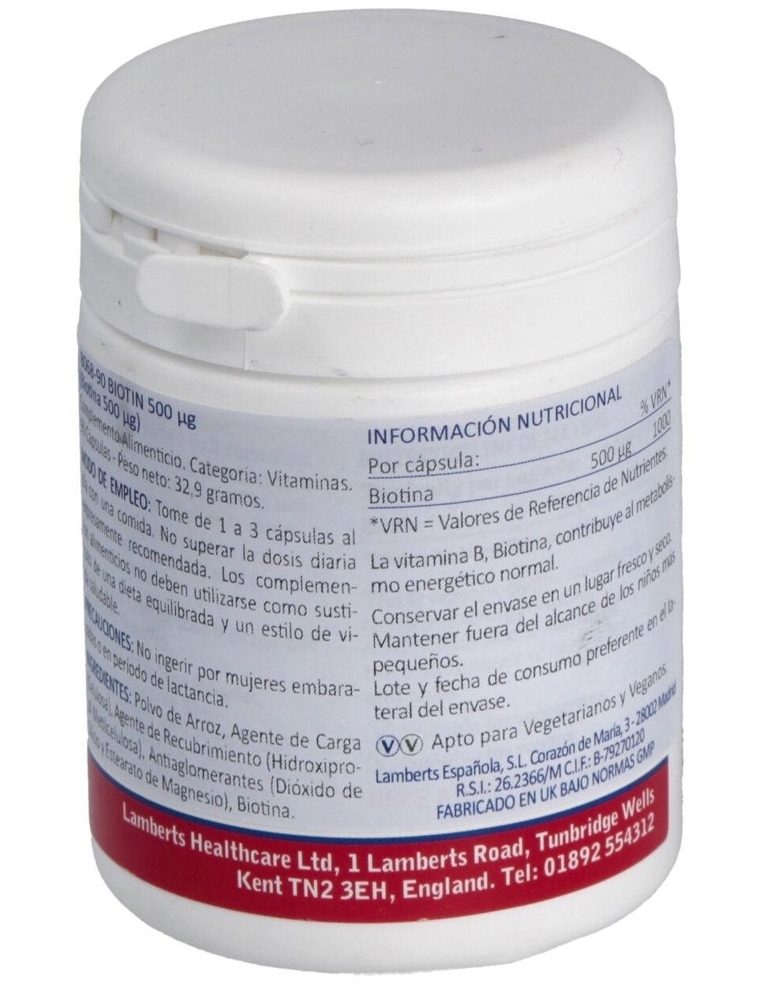 La biotina contribuye al mantenimiento normal de la piel, el cabello y las mucosas. También apoya a la función normal psicológica, al sistema nervioso y el metabolismo de los macronutrientes. Producto apto para veganos y vegetarianos.