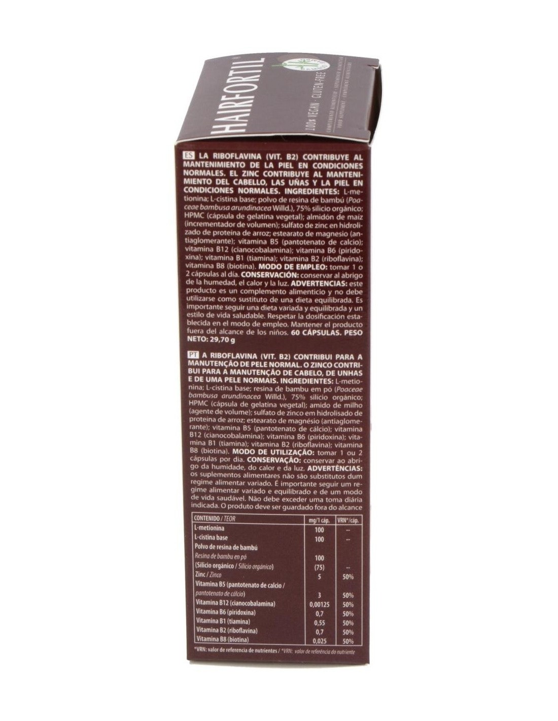 Por 1 cápsula: D,L-Metionina.....100 mg Levadura de cerveza (Saccharomyces cerevisae Meyer ex E. C. Hansen). L-Cistina............100 mg Extracto seco de berro (Lepidium sativum L.). Polvo de resina de bambú (75% silicio orgánico) Vitaminas B1, B5, B6, B2, B8 y B12 Óxido de zinc. Cápsulas: gelatina vegetal.