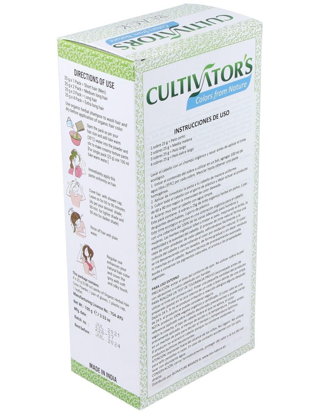 Lavar el cabello con un champú orgánico y secar antes de aplicar el tinte ecológico. Abrir el sobre o los sobres a utilizar según largo del pelo y volcar el contenido en un bol, agregar 100 ml de agua tibia (35ºC) por cada sobre. Mezclar hasta obtener una pasta homogénea. Aplicar de inmediato la pasta a tu cabello de manera uniforme. Cubrir todo el cabello con el gorro de plástico y dejar actuar el producto de 60 a 90 min según intensidad de color deseada (60 min para obtener un tono más claro y 90 min para la máxima intensidad de cada color). Aclarar muy bien el cabello con agua limpia.