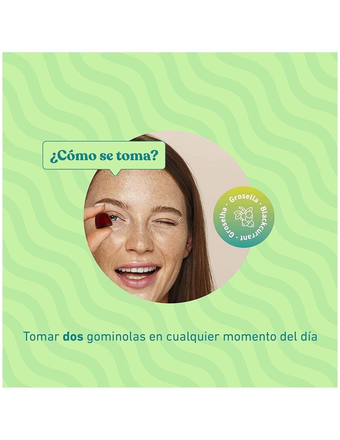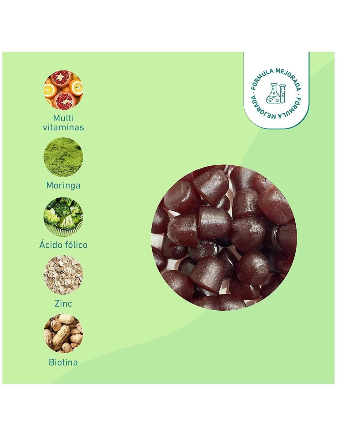 FOS (Fructooligosacáridos), Agua, Maltodextrina, Gelificante (Pectina), Polvo de Moringa (Moringa Oleifera, Hojas), Ácido L-Ascórbico (Vitamina C), Acetato de DL-alfa Tocoferilo (Vitamina E), Acidulante (Ácido Cítrico), colorante (antocianinas), citrato de zinc, corrector de acidez (citrato de sodio), aceite vegetal (coco), aroma de grosella negra, acetato de retinilo (vitamina A), D-pantotenato de calcio (ácido pantoténico), clorhidrato de piridoxina (vitamina B6), antiaglomerante (cera de carnauba), D-biotina (biotina) y ácido pteroilmonoglutámico (ácido fólico).