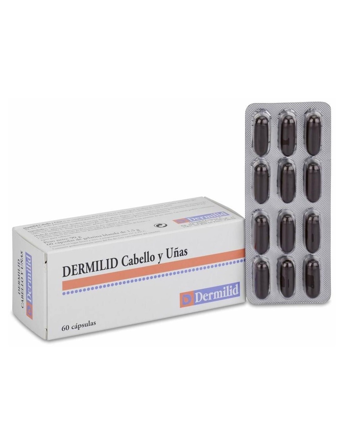 Dermilid Cabello y Uñas es el aporte nutricional específico y completo para el Cabello y las Uñas. Su contenido en aminoácidos, vitaminas y oligoelementos proporciona al organismo elementos esenciales para el normal mantenimiento del cabello y de las uñas. Dermilid cabello y uñas puede ser de utilidad en casos de alopecia areata, alopecia androgenética, alopecia en telógeno, alopecia en anágeno, tricodistrofias, seborrea capilar, dermatitis seborreica y distrofias ungueales. Complemento de la dieta rico en aceite vegetal, levadura de cerveza, L-Cisitna, vitaminas (B1, B2, B3, B6, ácido pantoténico, cianocobalamina 0,1% y biotina) y minerales (calcio, hierro, zinc y cobre).