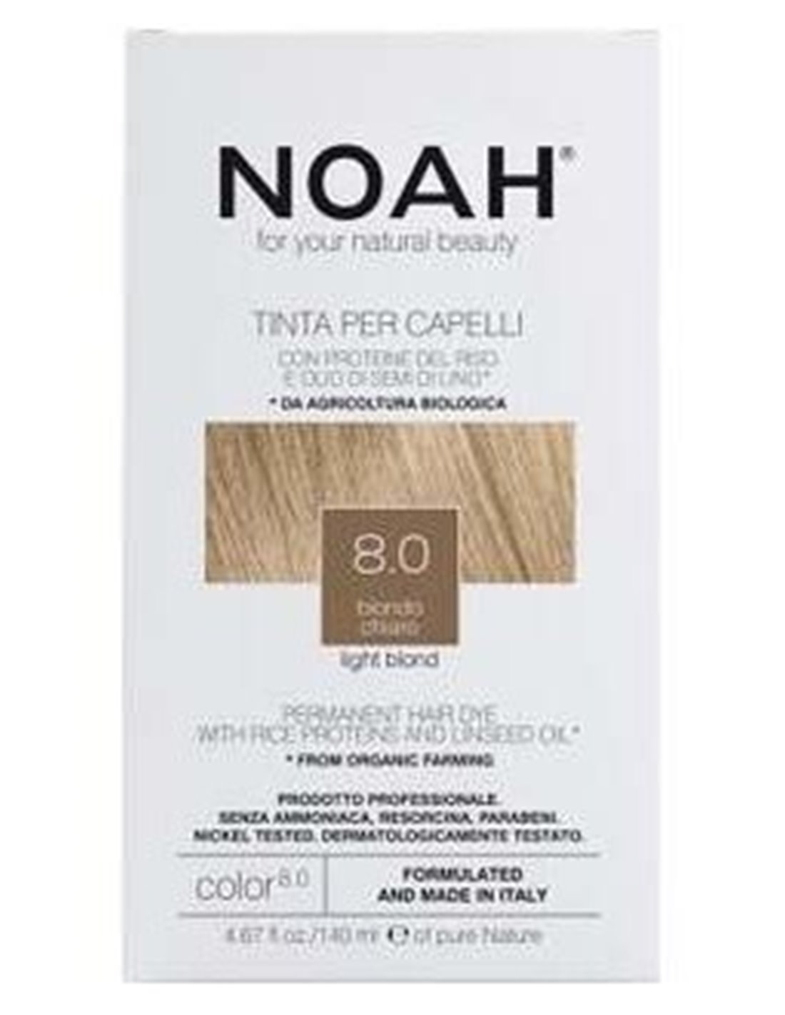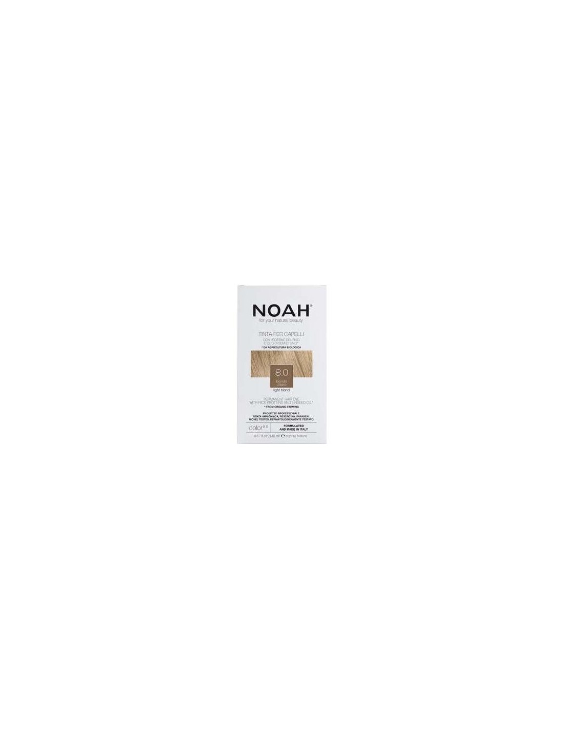 Tinte con proteínas de arroz y aceite de linaza que aporta al cabello el color deseado y la cobertura de canas desde la primera aplicación, respetando al máximo el cuero cabelludo y la fibra capilar. La innovadora formulación no contiene amoníaco, parabenos y resorcinol en todos los matices, permite obtener el color deseado con total seguridad y practicidad y también es apto para pieles delicadas. Las proteínas de arroz y el aceite de linaza crean una película natural que protege el cabello, aportándole suavidad, cuerpo, elasticidad y brillo. La acción sinérgica con el champú Colore 1.6 realza el color prolongando su duración e intensidad y aporta al cabello hidratación, flexibilidad y resistencia a la rotura.\ \ El envase contiene: 1 tubo NOAH Hair coloración en crema (50ml monodosis), 1 bote NOAH Color Revealer (75ml monodosis), 1 folleto de instrucciones de uso, 1 par de guantes desechables, 1 NOAH Hair 1.6B Champú+ sobre Color Acondicionador Protection (dosis única de 15ml).