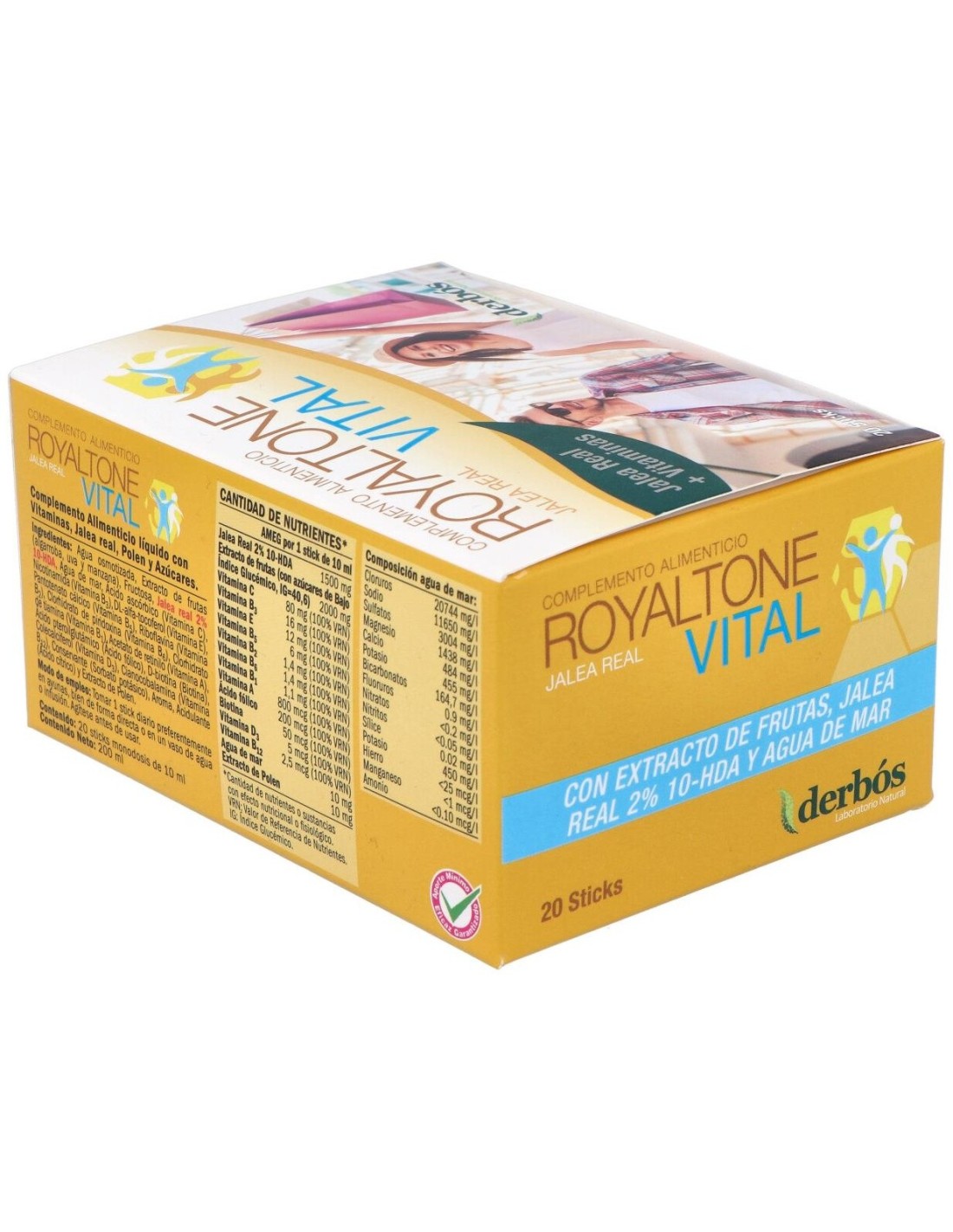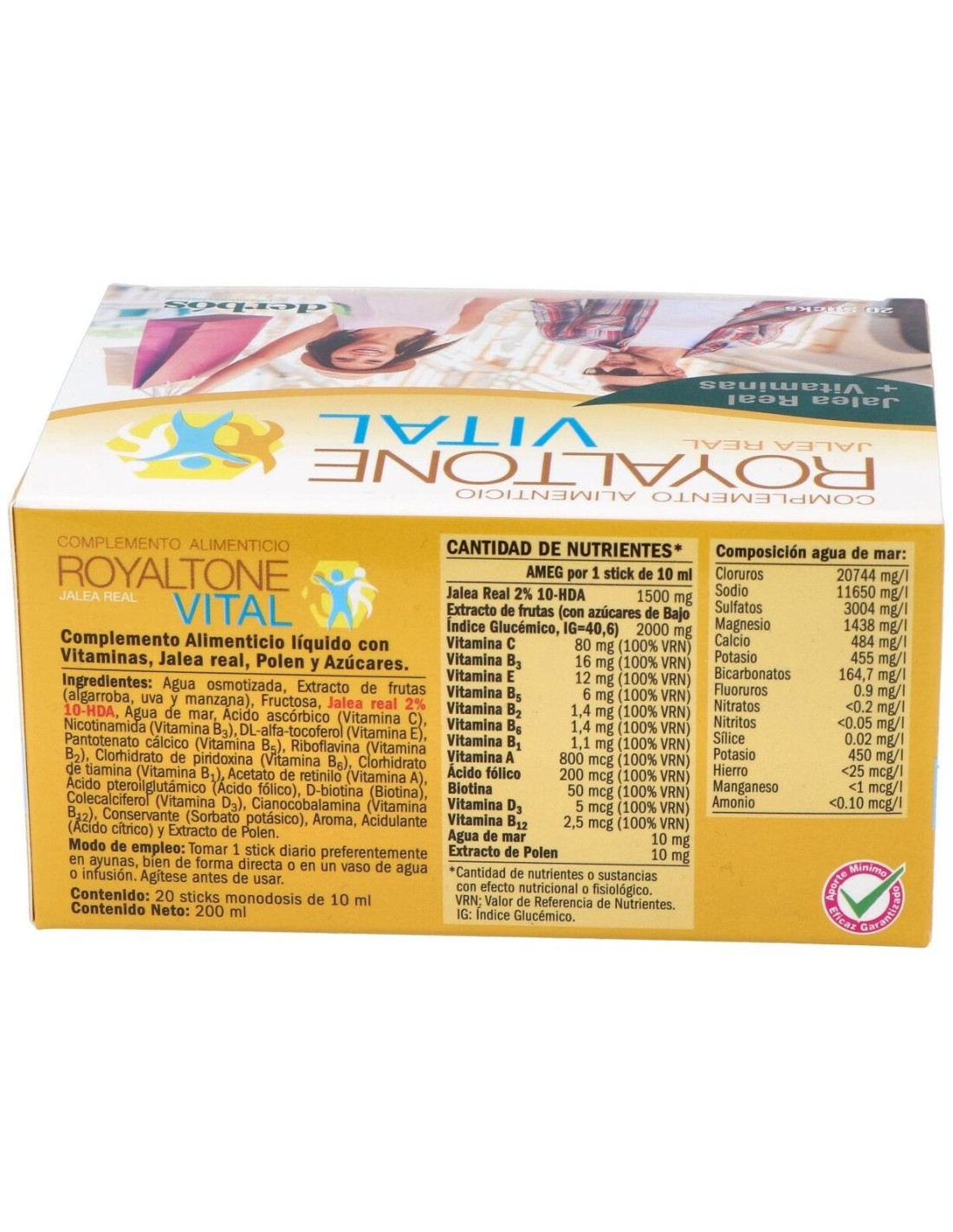 Complemento alimenticio formulado a base de jalea real, vitaminas y polen. Presentación en 20 sobres tipo sticks. Contribuye al correcto desempeño físico y mental. A su combinación de ingredientes se le atribuyen propiedades energizantes. Indicado para adultos en casos de cansancio o fatiga.