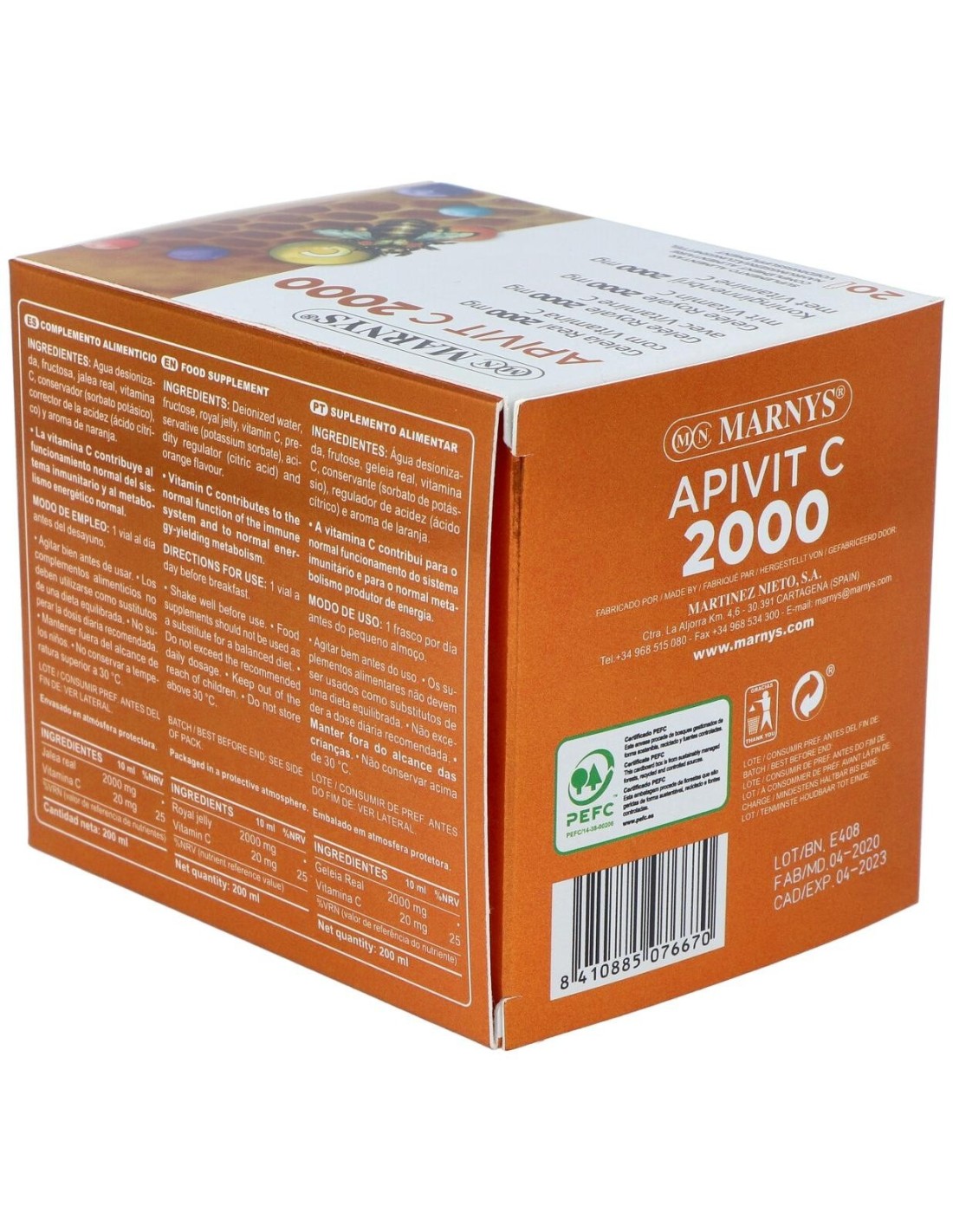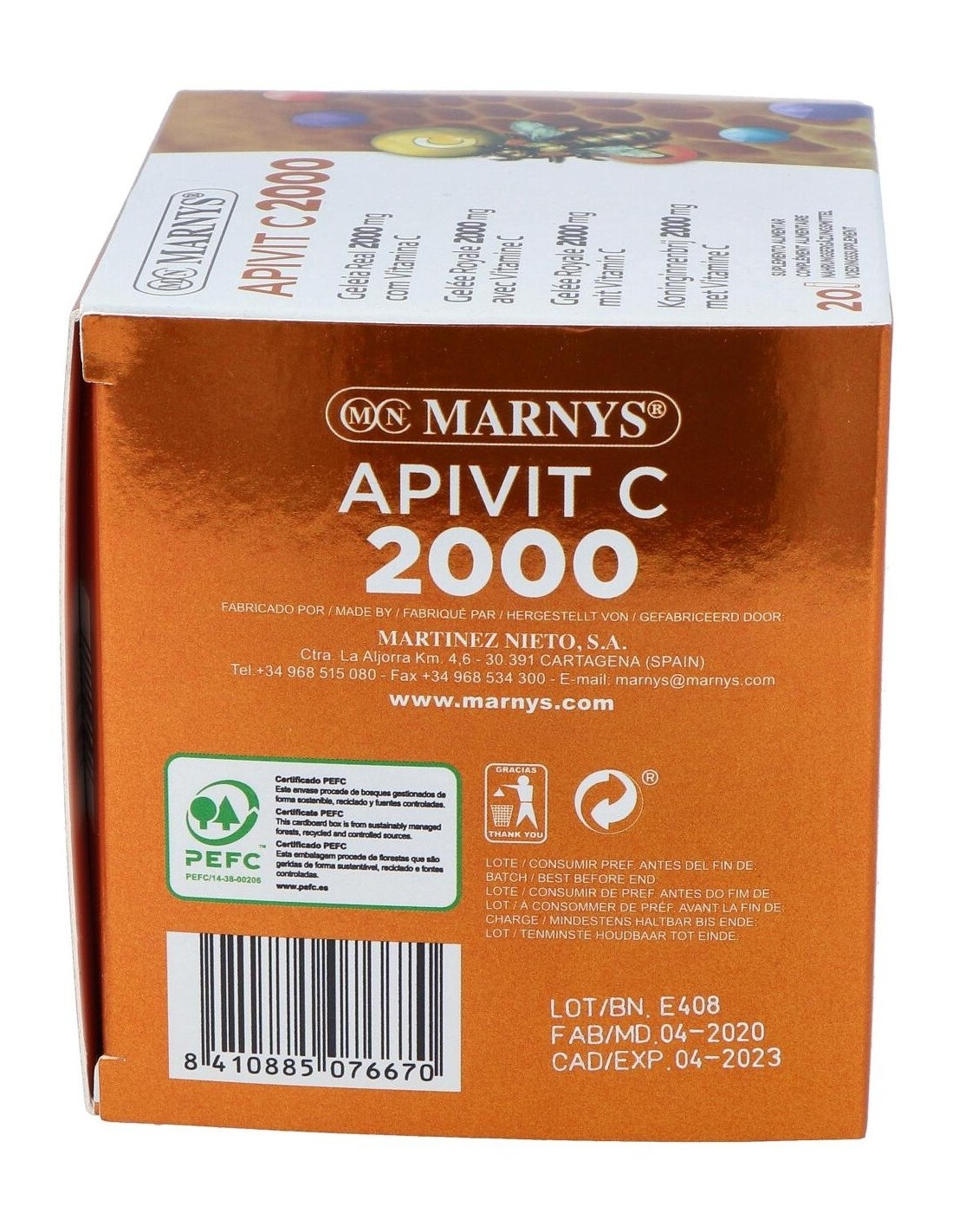 Marnys® Apivit C es un complemento alimenticio con jalea real y vitamina C que ayuda a aumentar la vitalidad (mejorando los cuadros de fatiga) y contribuye a la estimulación del sistema inmunológico, así activando las defensas naturales del organismo.