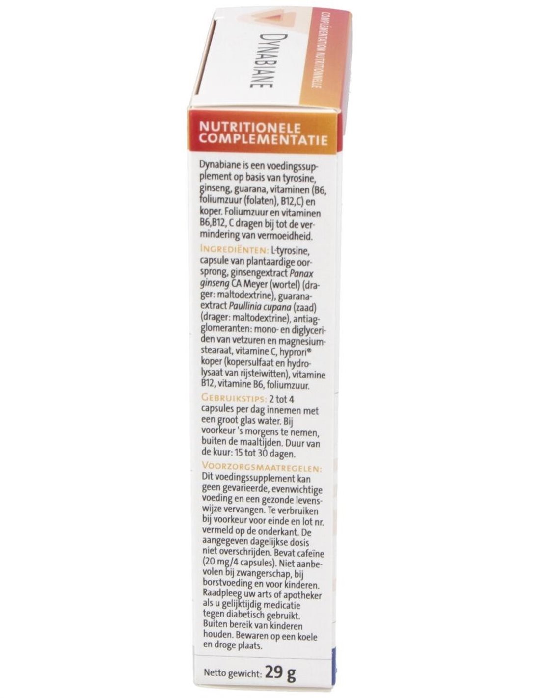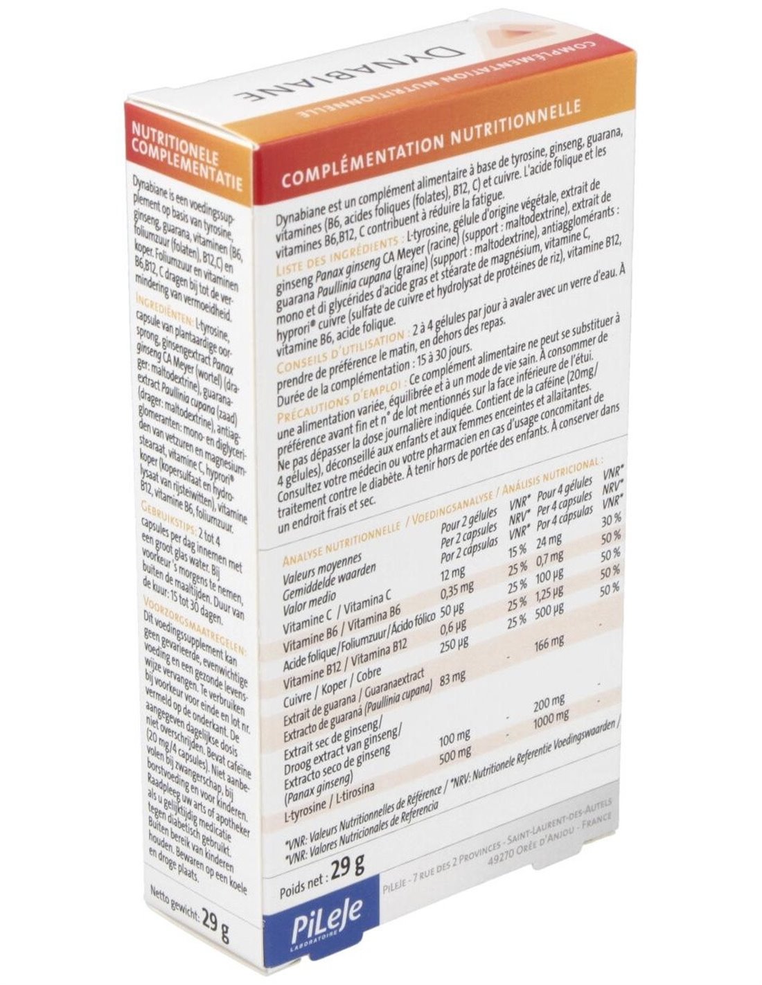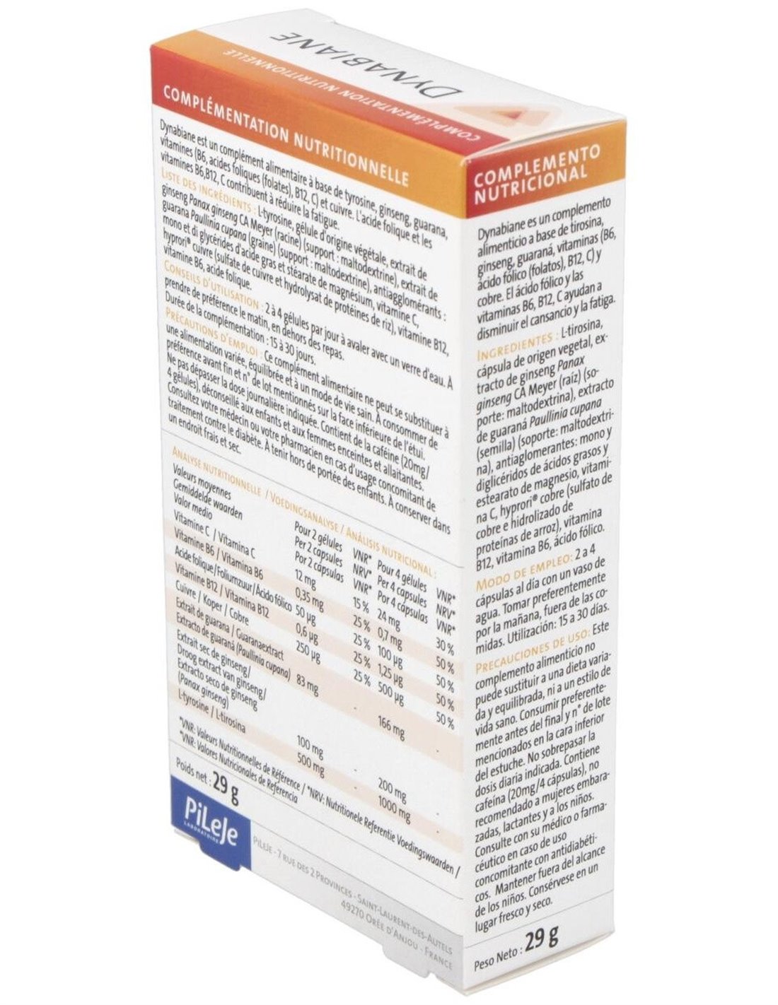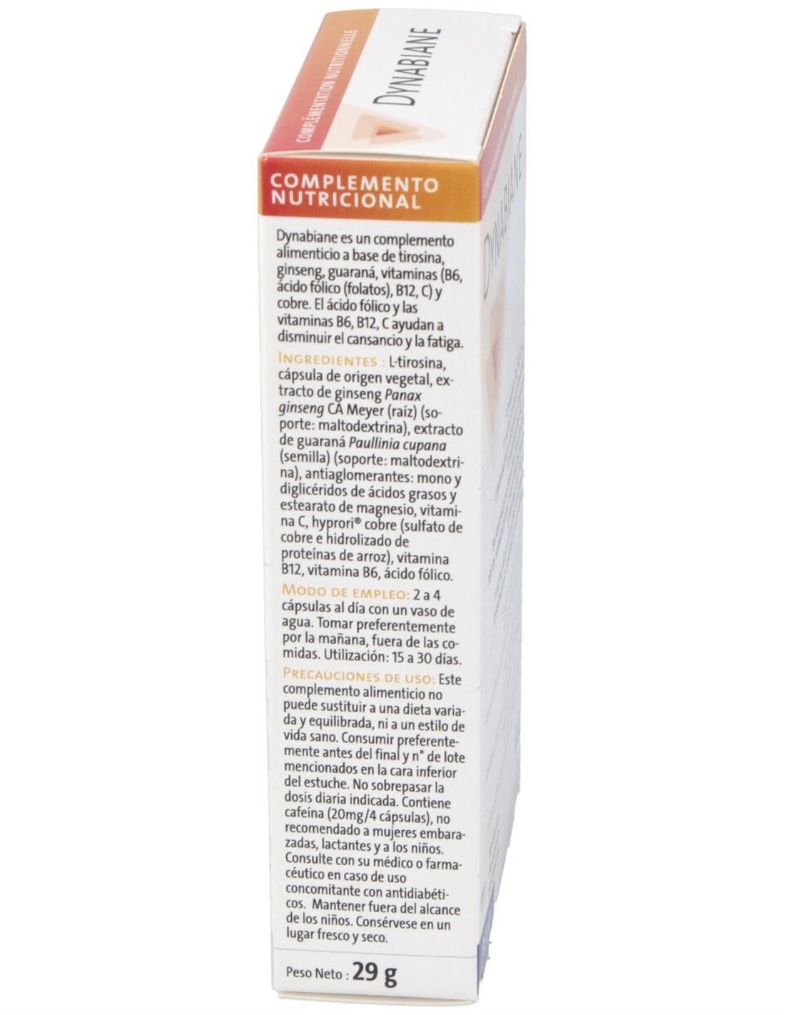 Dynabiane es un complemento alimenticio que favorece el dinamismo y la vitalidad gracias a su fórmula con ginseng (ayuda a mantener el tono intelectual), tirosina (precursor de neutransmisores) y guaraná (contribuye a reducir el cansancio psíquico).