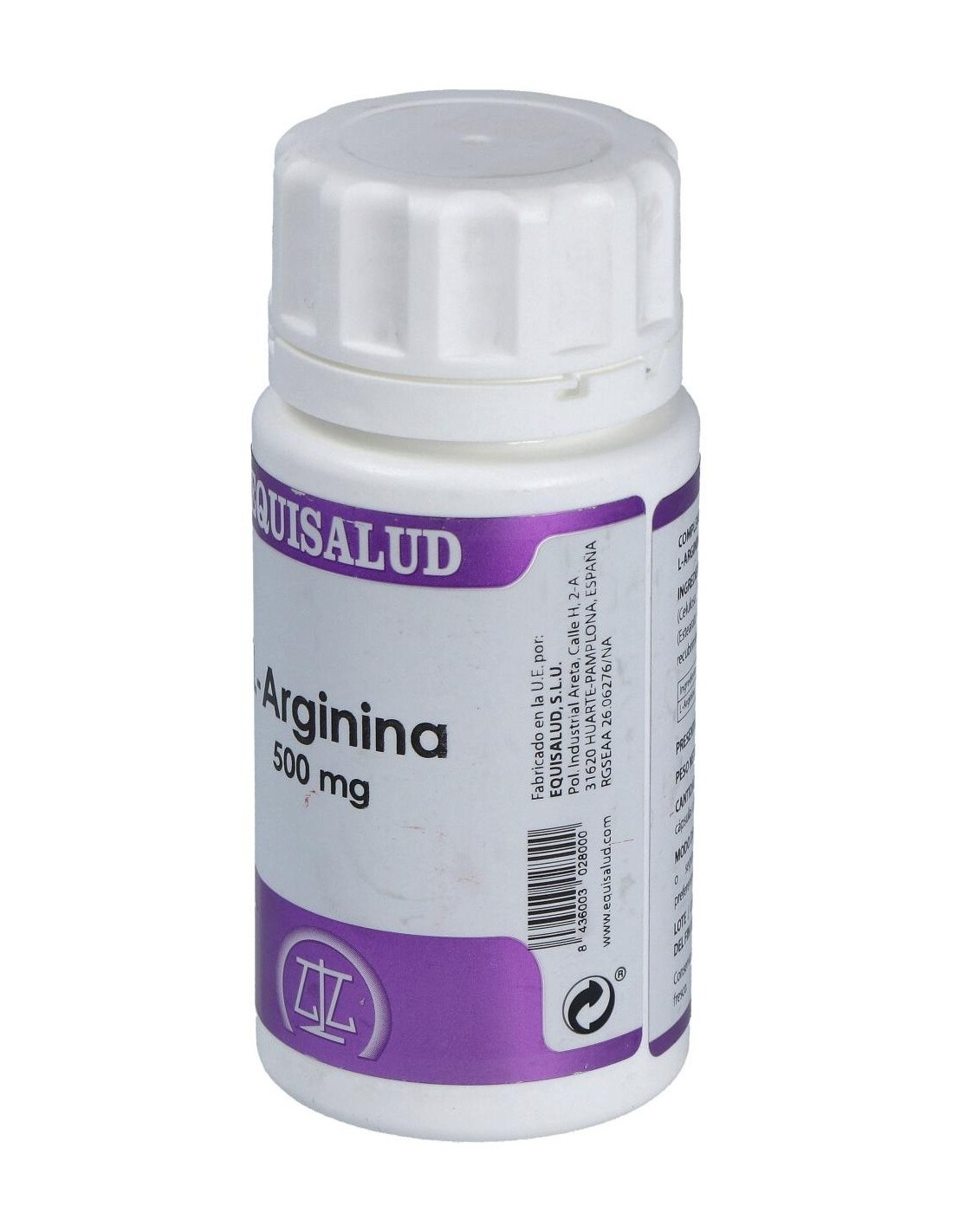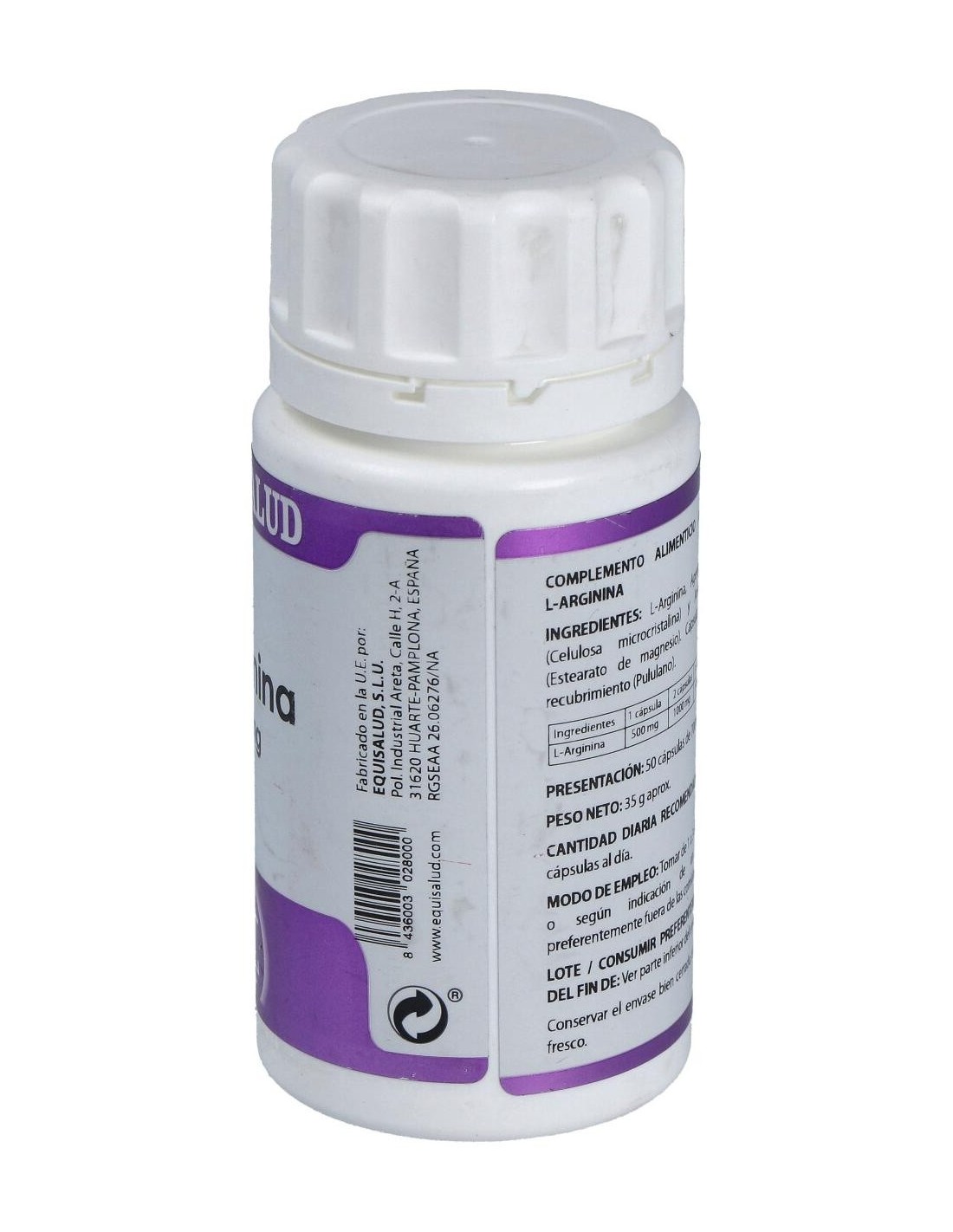 L-Arginina 500 mg, Celulosa microcristalina y Estearato de magnesio. Envoltura de polisacárido de origen vegetal (pululano)