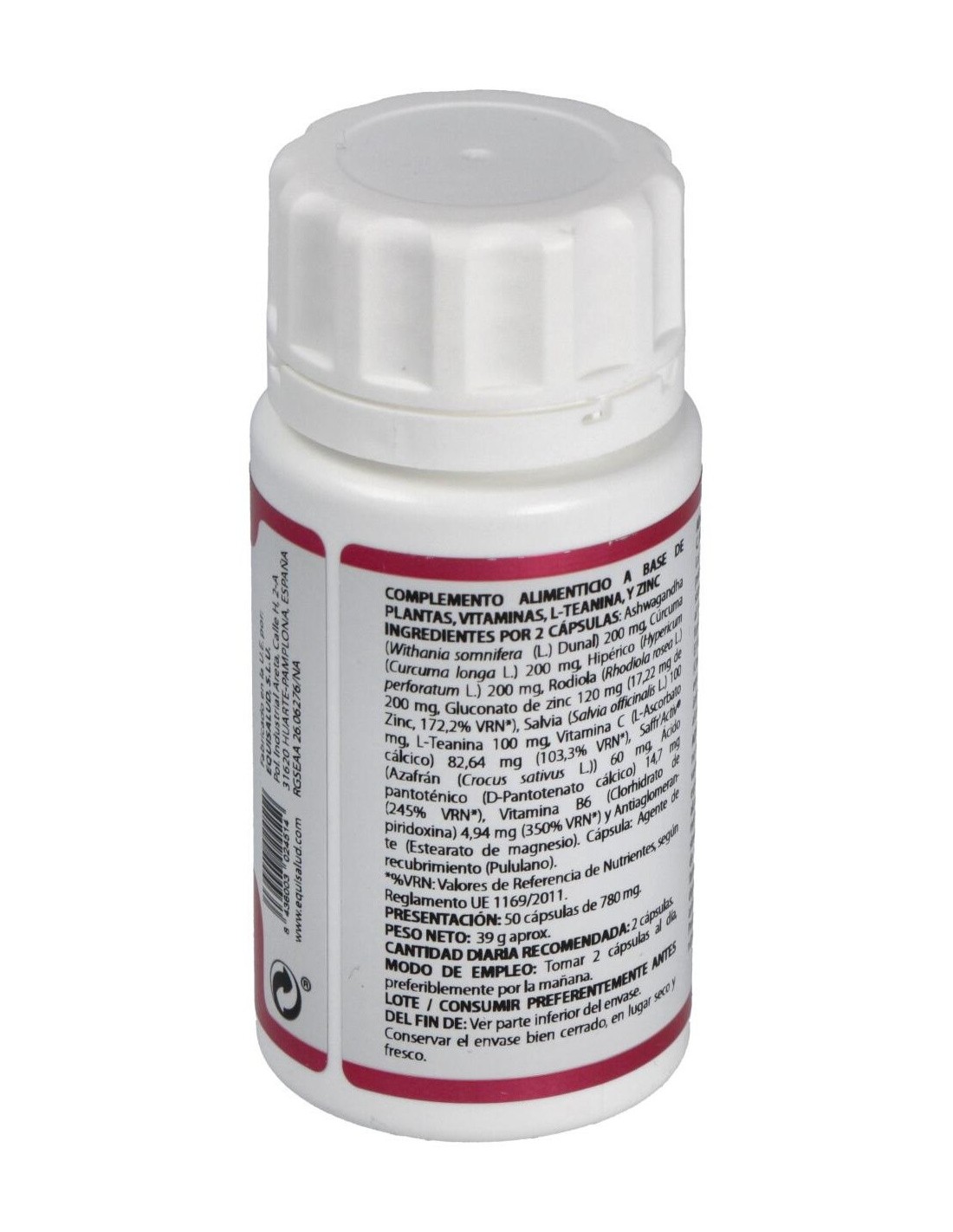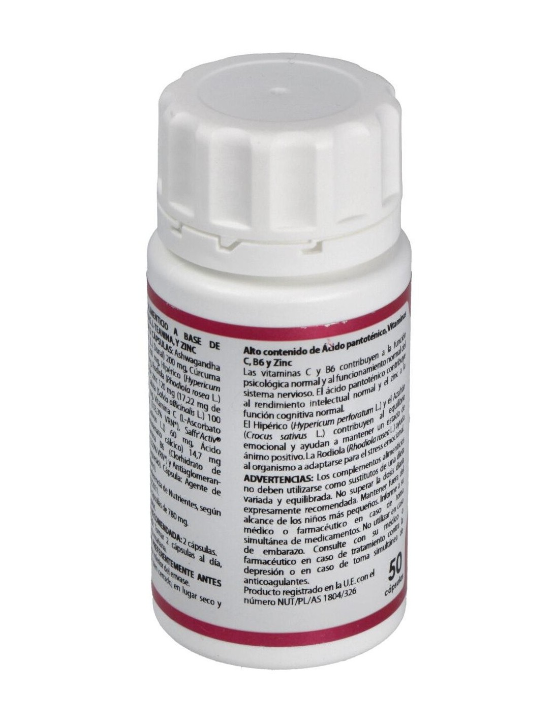 ASHWAGANDHA EXTRACTO SECO (WITHANIA SOMNIFERA (L.) DUNAL), 100 MG; CÚRCUMA EXTRACTO SECO (CURCUMA LONGA L.), 100 MG; HIPÉRICO EXTRACTO SECO (HYPERICUM PERFORATUM L.), 100 MG; RODIOLA EXTRACTO SECO (RHODIOLA ROSEA L.), 100 MG; GLUCONATO DE ZINC (14,35% ZINC), 60 MG; SALVIA EXTRACTO SECO (SALVIA OFFICINALIS L.), 50 MG; L-TEANINA, 50 MG; ÁCIDO ASCÓRBICO (ASCORBATO CÁLCICO), 41,32 MG; AZAFRÁN EXTRACTO SECO SAFFR'ACTIV® (CROCUS SATIVUS L.), 30 MG; ÁCIDO PANTOTÉNICO (D-PANTOTENATO CÁLCICO), 7,35 MG; VITAMINA B6 (PIRIDOXINA CLORHIDRATO), 2,47 MG. EXCIPIENTES TECNOLÓGICOS: ESTEARATO DE MAGNESIO (ANTIAGLOMERANTE), C.S.