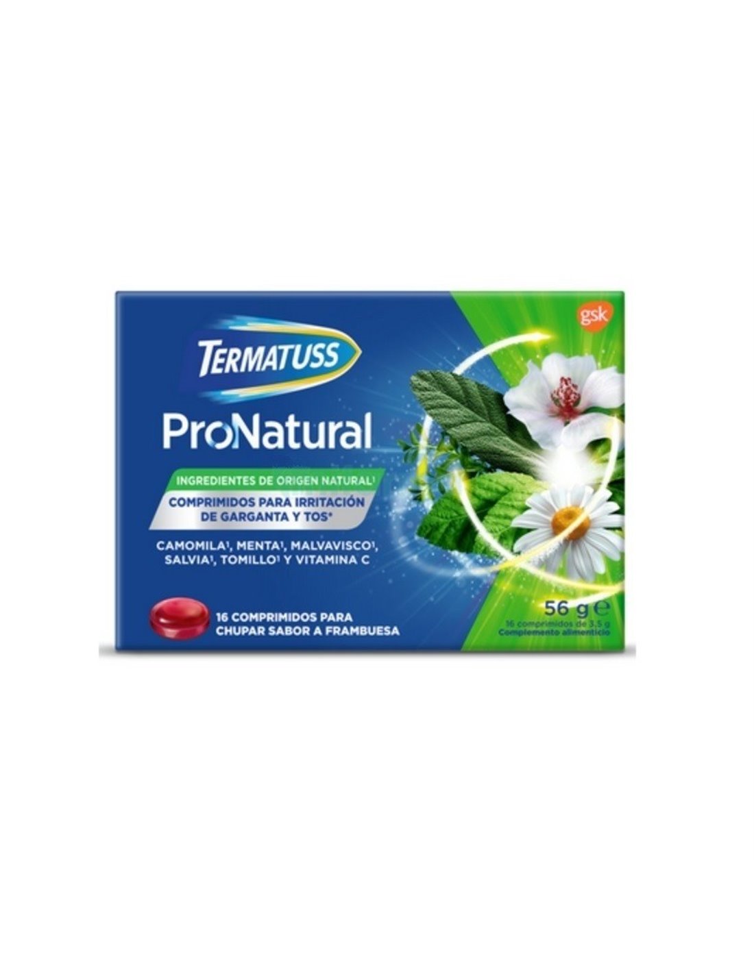 Complemento alimenticio elaborado a base de extractos vegetales que suavizan la tos y disminuyen la irritación en la garganta. Elaborado a base de camomila, malvavisco, menta, salvia, tomillo y vitamina C. Presentados en formato de comprimidos, contribuyen al cuidado y reducción de malestar causado por tos seca y con expectoración.