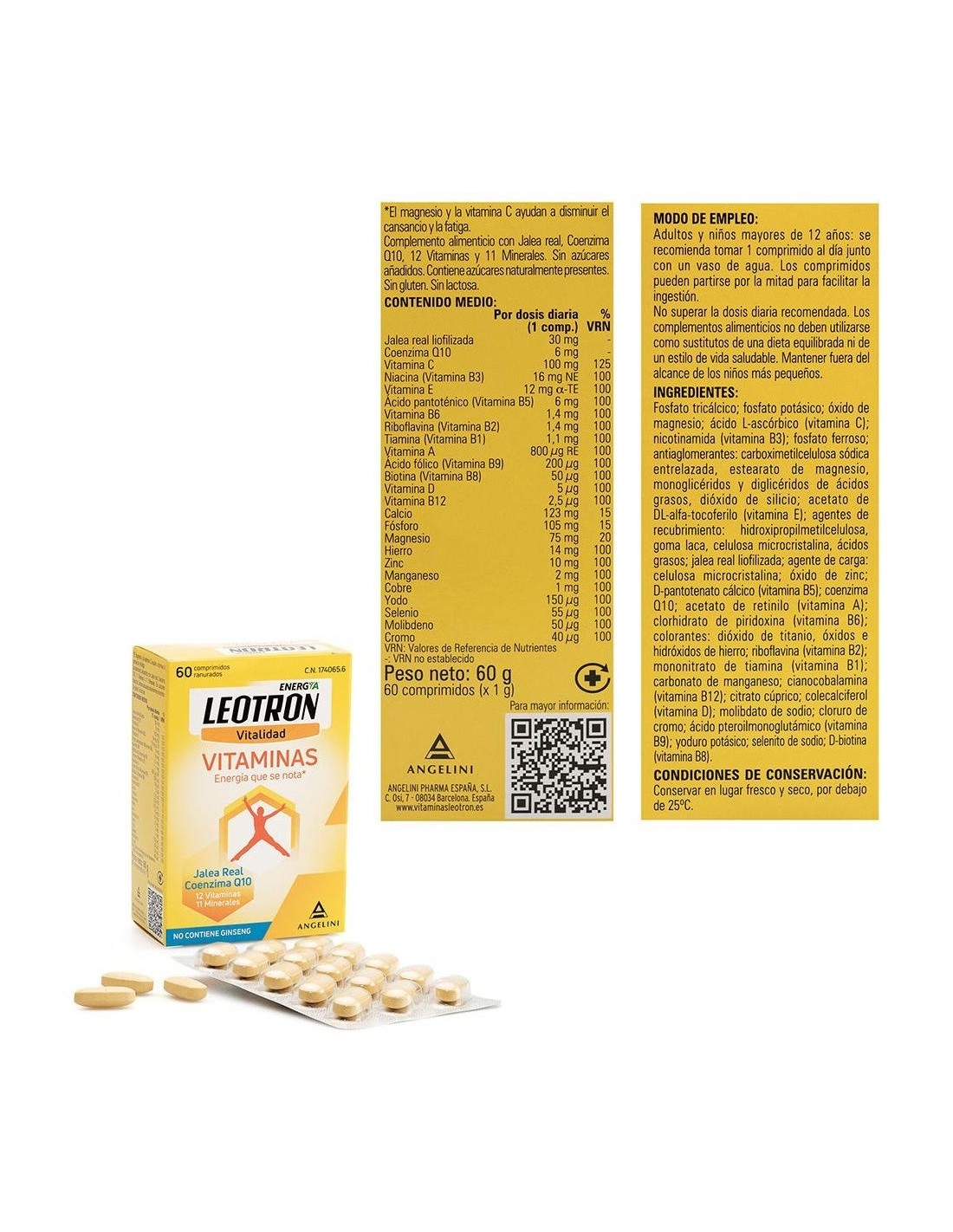 Complemeto a base de jalea real, Q10, 12 vitaminas y 11 minerales. Las vitaminas B2, B5, B6, B12, C, el magnesio y el hierro ayudan a disminuir el cansancio y la fatiga.