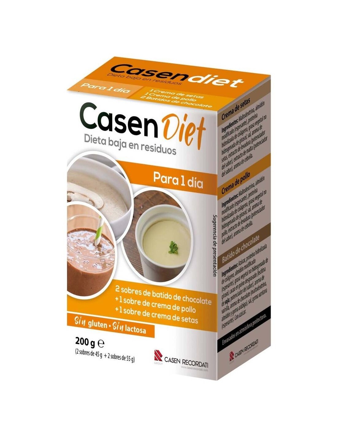Dieta baja en residuos para 1 día. Contiene:\ 2 sobres de batido de chocolate + 1 sobre de crema de pollo + 1 sobre de crema de setas.