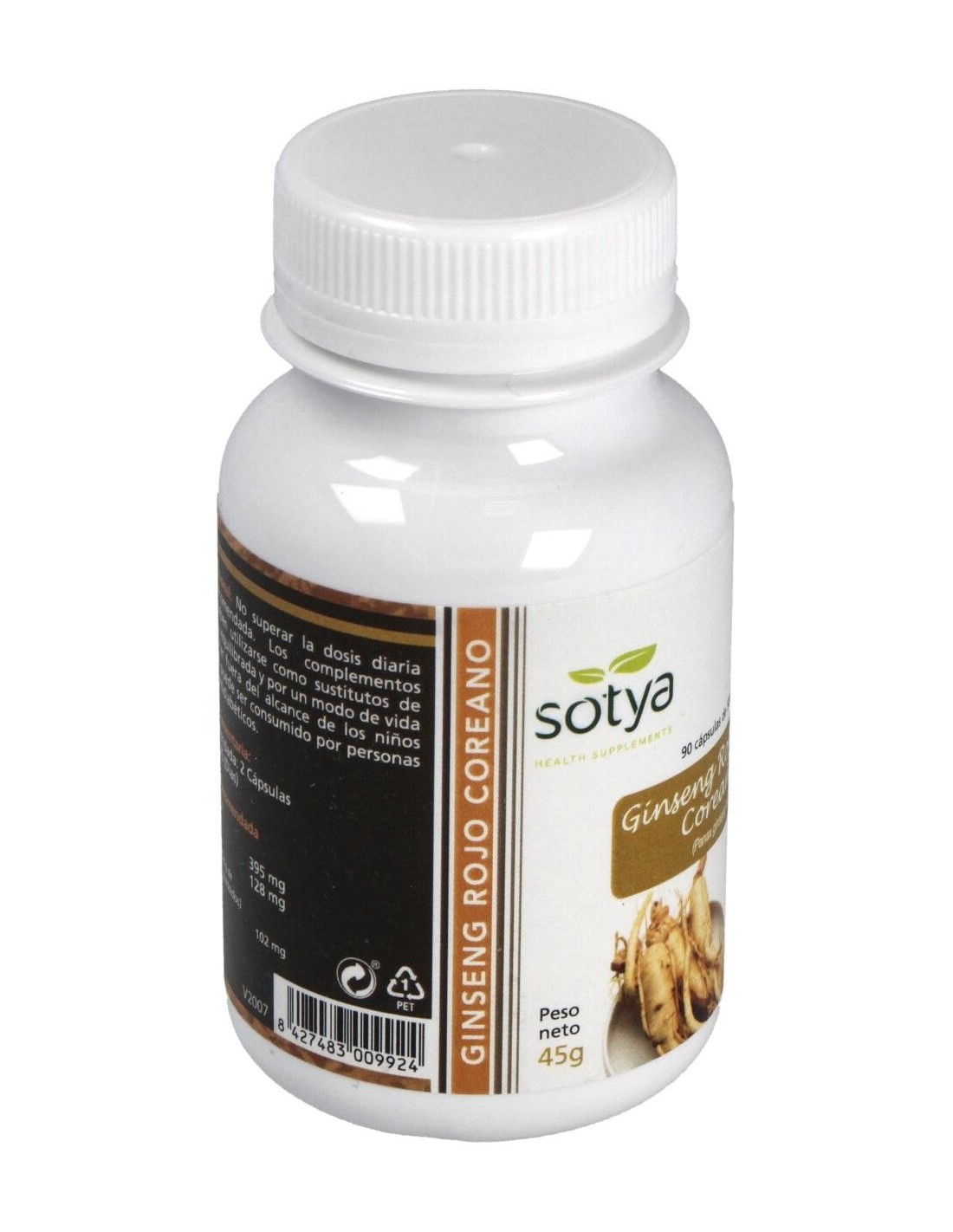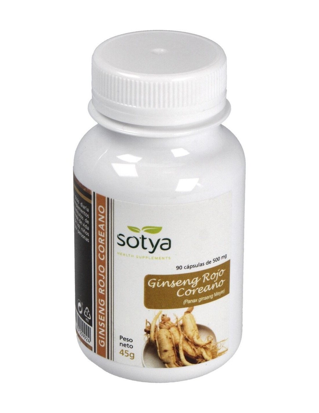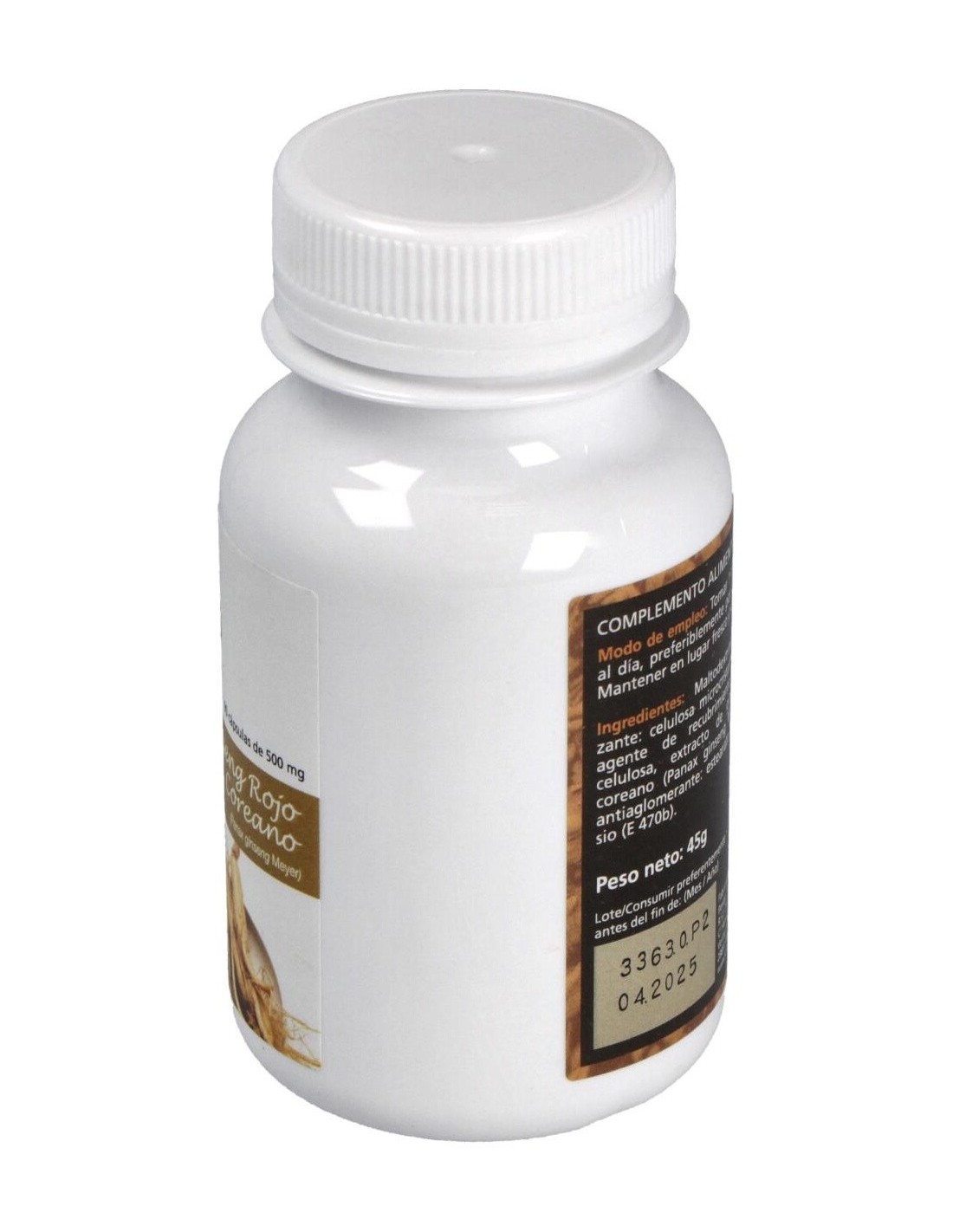 90 cápsulas de 600mg: con 60mg de extracto de raíz principal de ginseng rojo coreano (Panax ginseng) equivalente a 500mg de raíz fresca.