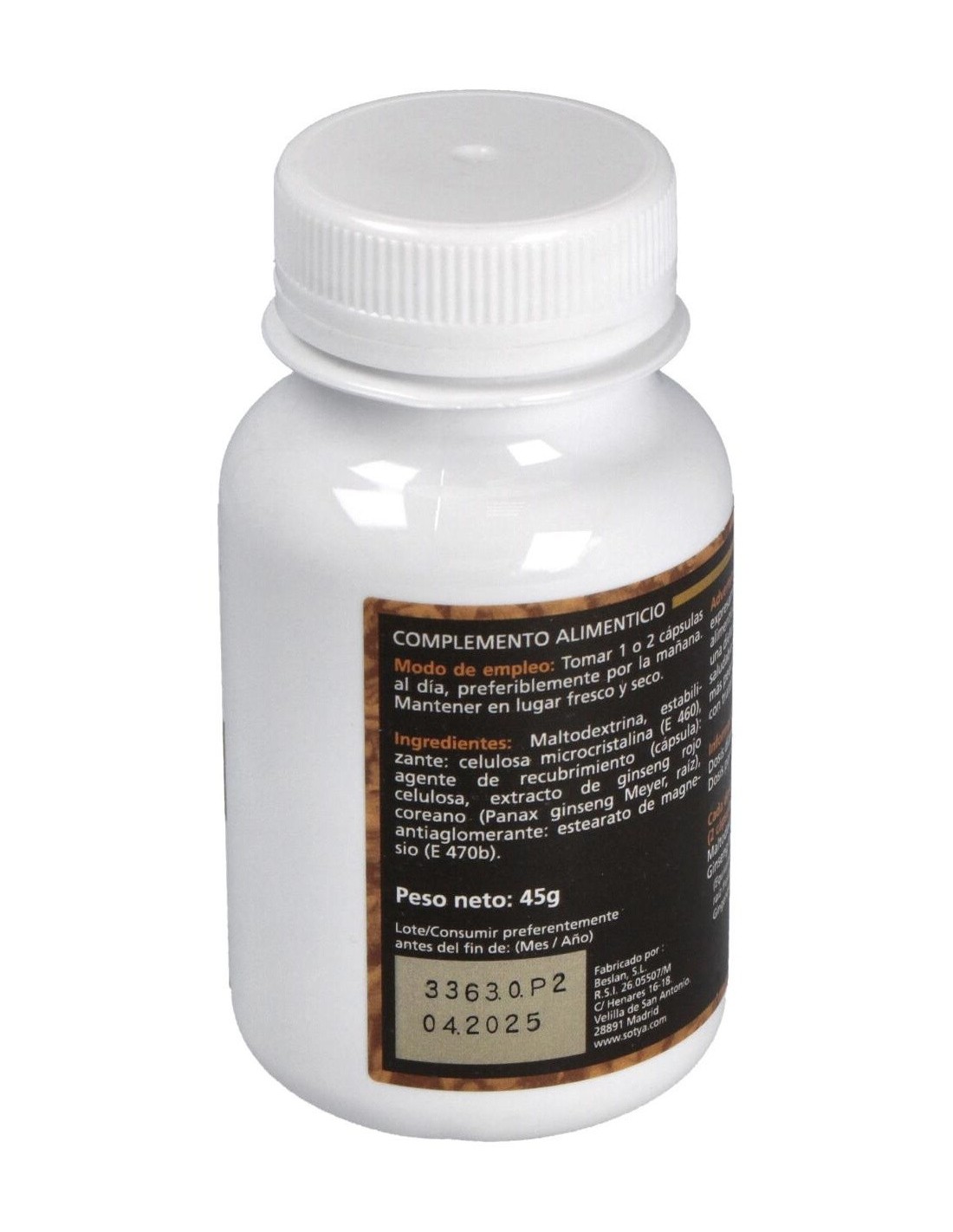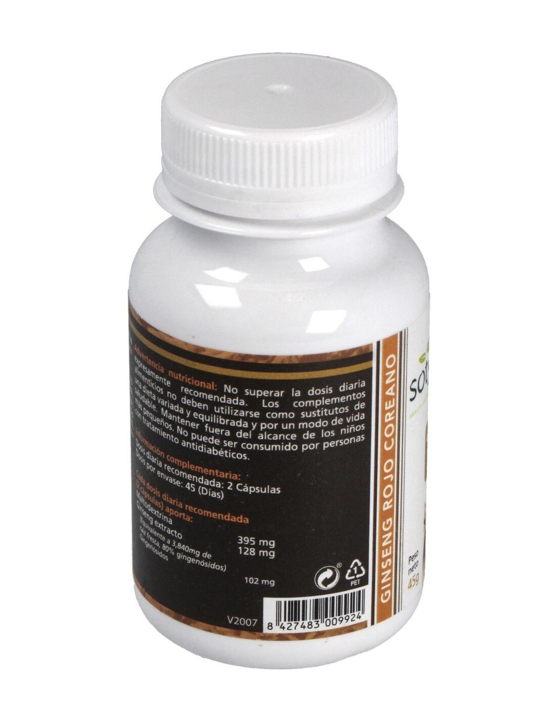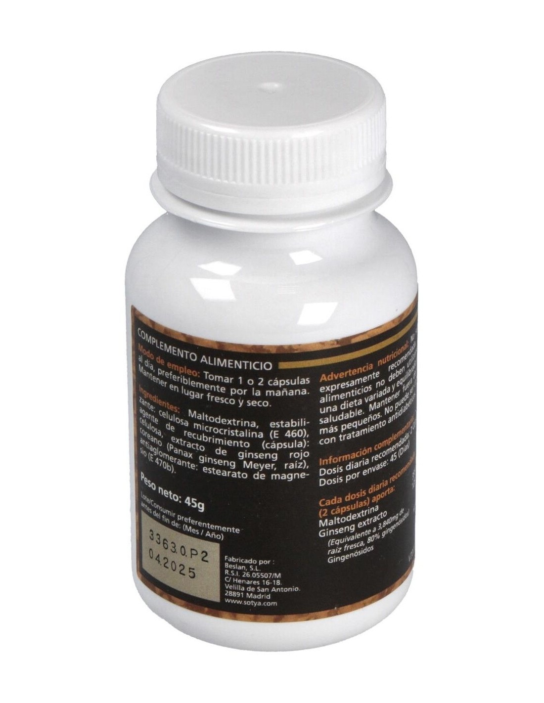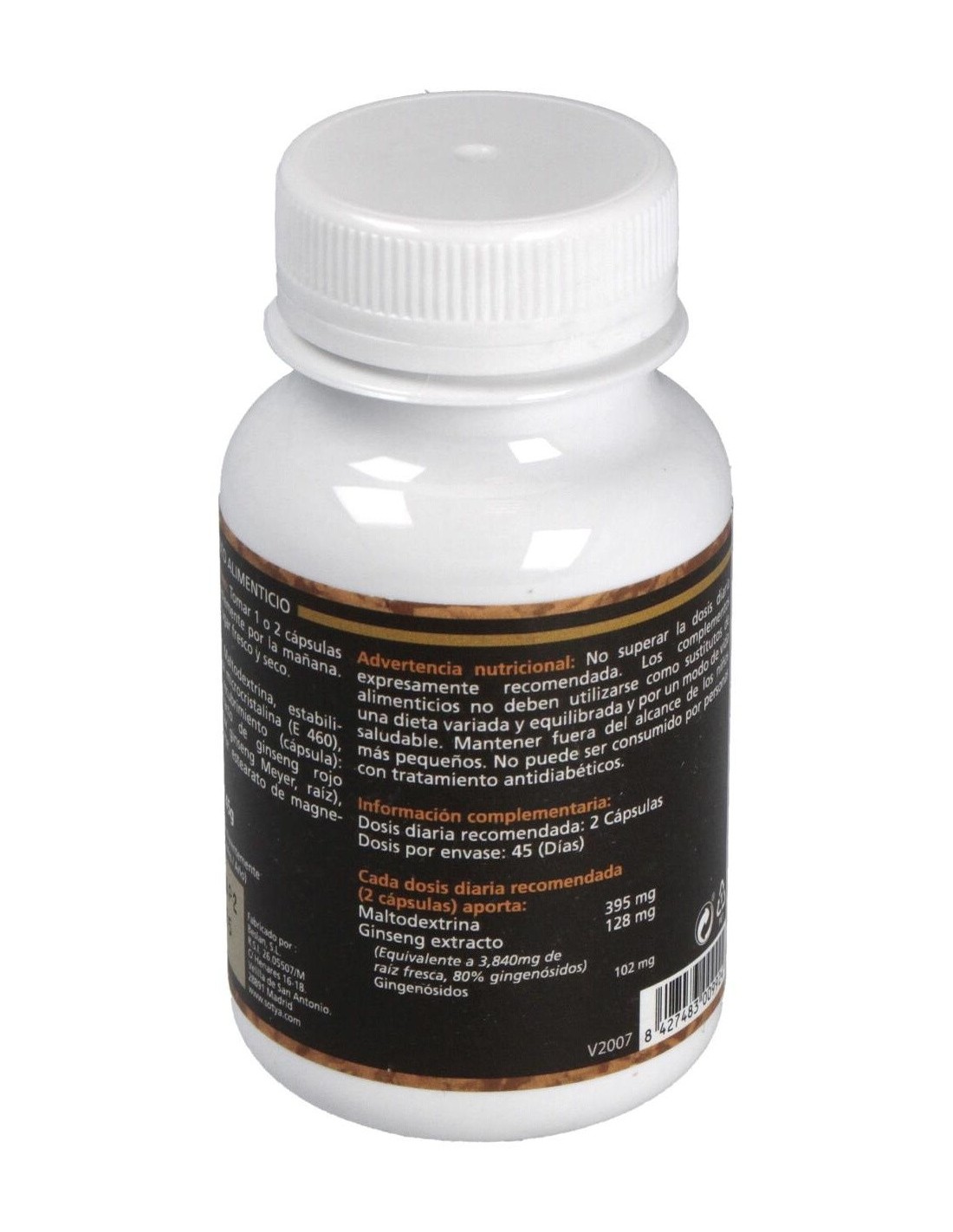 90 cápsulas de 600mg: con 60mg de extracto de raíz principal de ginseng rojo coreano (Panax ginseng) equivalente a 500mg de raíz fresca.