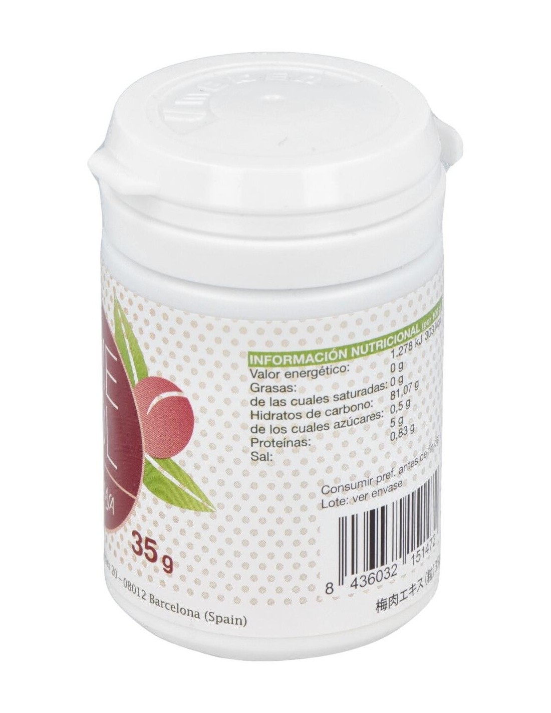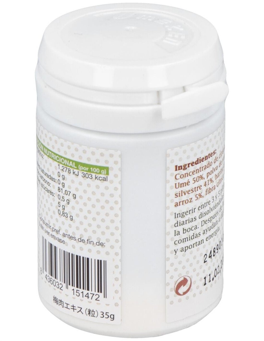 Concentrado de ciruela Umé 50%, polvo de yam silvestre 41%, harina de arroz 5%, fibra cítrica 4%.