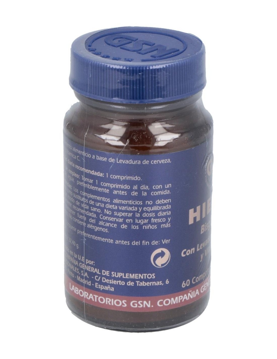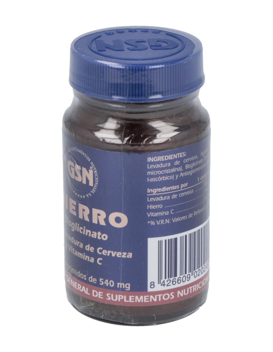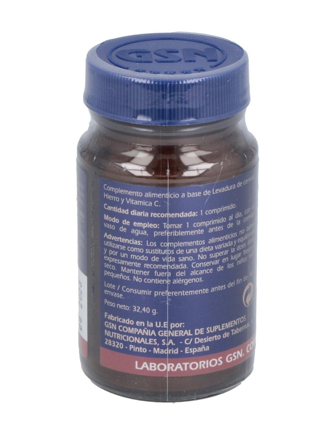 Hierro, bisglicinato 78 mg aporta 14 mg de hierro, Vitamina C 60 mg, Levadura de cerveza 300 m.